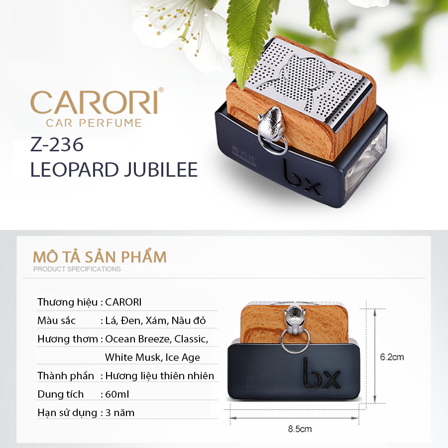 - Nước hoa ô tô CARORI LEOPARD JUBILEE Z-2363 White Musk 60ml được chế tạo với công thức đặc biệt của các chuyên gia hàng đầu, với hương thơm táo bạo và nồng nàn làm xe bạn thêm sang trọng và quý phái khi chào đón những vị khách hàng hay đối tác. Ngoài ra, sản phẩm còn giúp khử sạch mùi hôi, giữ cho không khí trong xe luôn sạch sẽ và thoáng mát. Với thành phần hoàn toàn lành tính, sản phẩm đảm bảo không gây nên bất cứ tác dụng phụ cũng như ảnh hưởng gì đến sức khỏe của bạn khi sử dụng.