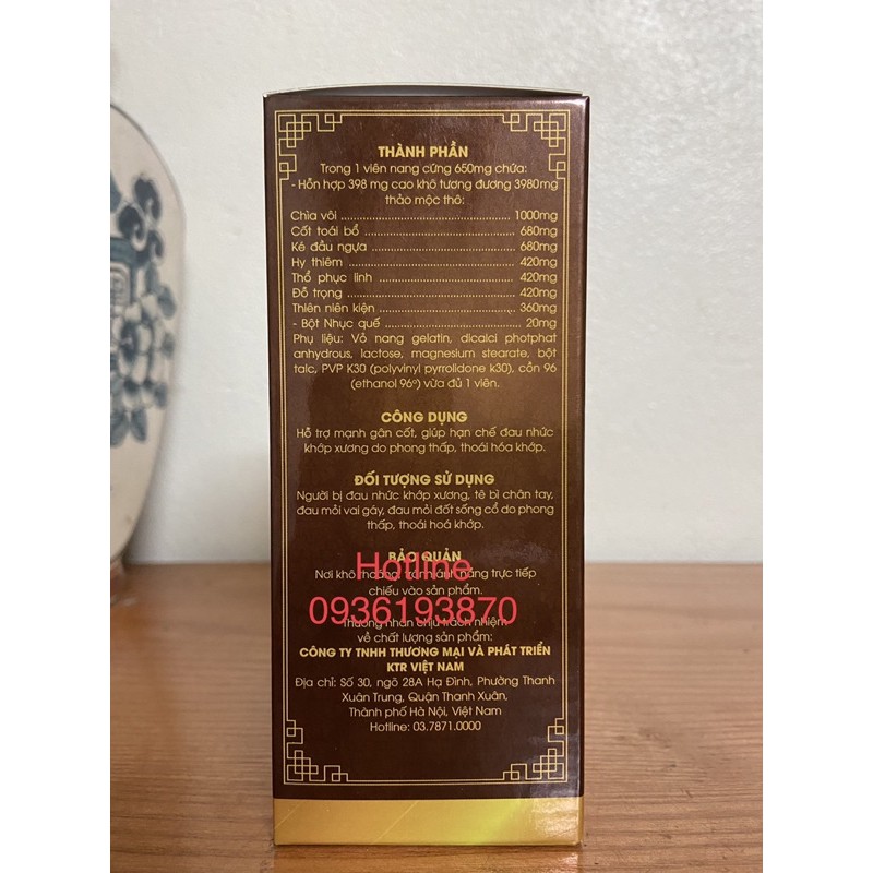 Hoàng cốt vương Thành phần: Trong 1 viên nang cứng 650mg chứa: - Hỗn hợp 398mg cao khô tương đương 3980mg thảo mộc thô: Chìa vôi: 1000mg Cốt toái bổ: 680mg Ké đầu ngựa: 680mg Hy thiêm: 420mg Thổ phục linh: 420mg Đỗ trọng: 420mg Thiên niên kiện: 360mg - Bột nhục quế: 20mg Phụ liệu: Vỏ nang gelatin, dicalci photphat anhydrous, lactose, magnesium stearate, bột talc, PVP K30 (polyvinylpyrrolidone K30), cồn 96 (ethanol 96%) vừa đủ 1 viên. Công dụng: Hỗ trợ mạnh gân cốt, hỗ trợ hạn chế đau nhức xương khớp do phong thấp, thoái hóa khớp. Đối tượng sử dụng: Người bị đau nhức mỏi xương khớp, tê bì chân tay, đau mỏi vai gáy, đau mỏi đốt sống cổ do phong thấp, thoái hóa khớp. Cách dùng: Ngày uống 2-3 lần, mỗi lần 2 viên sau ăn 30 phút. Uống tăng cường: ngày uống 2-3 lần, mỗi lần 3-4 viên. Sản phẩm không phải là thuốc, không có tác dụng thay thế thuốc chữa bệnh. #hoangcotvuong#hoangcotvuong #viemkhop#viemkhop