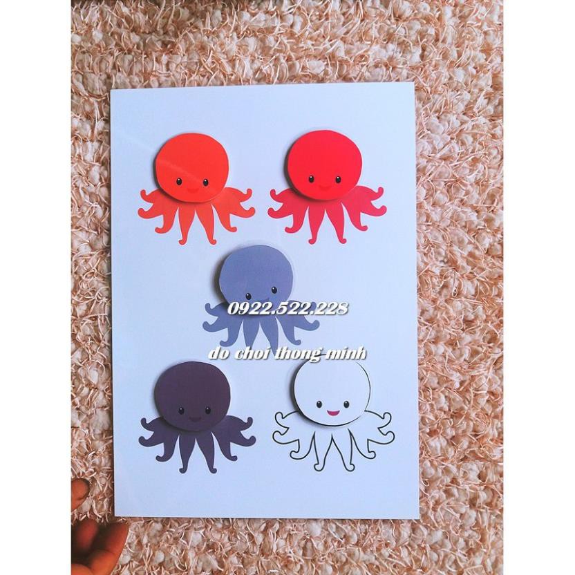 - 4 bảng chơi A4, mỗi trang in hình của 5 chú Bạch Tuộc với những màu sắc khác nhau và được kí hiệu bằng những điểm khác biệt trên người.
