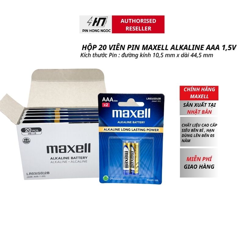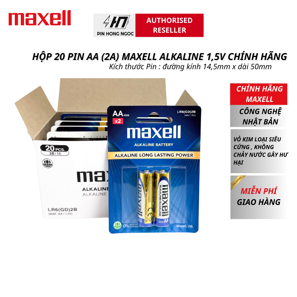 Pin Hồng Ngọc giới thiệu combo hộp 20 viên pin Maxell Alkaline AA, AAA 1.5V – lựa chọn hoàn hảo cho thiết bị điện tử, đồ gia dụng, đồ chơi, micro, điều khiển và nhiều thiết bị cần nguồn năng lượng ổn định.