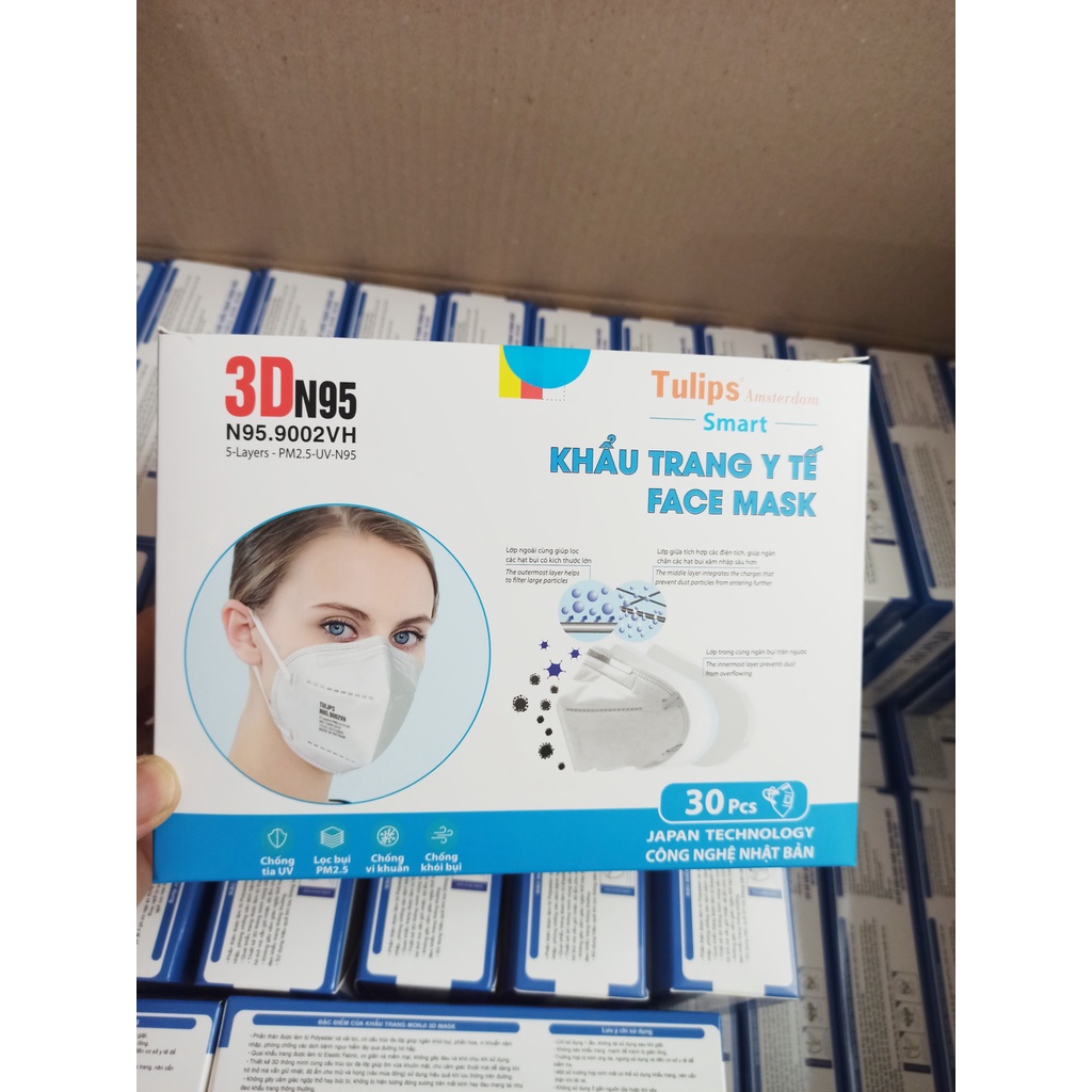 Hộp 30 khẩu trang N95 TuyLip - Loại không có van thở Phân loại: Khẩu trang N95 chống bụi PM2.5