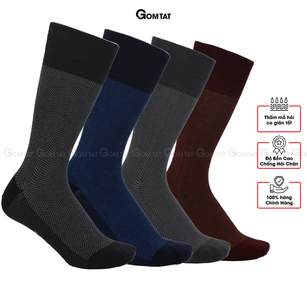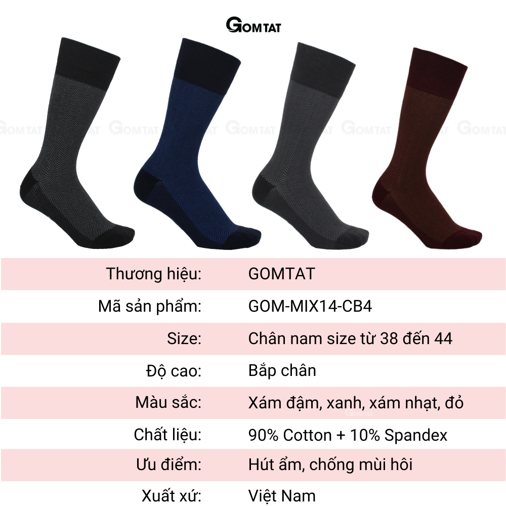 Hộp 4 đôi tất đi giày tây nam cổ cao 25cm họa tiết sọc xương cá, vớ nam công sở chất liệu cotton cao cấp - GOM-MIX14-CB4: Là loại vớ cổ Cao với tone màu cơ bản, rất dễ để phối với giày thể thao, hoặc giày tây công sở, chất liệu cotton khử mùi thoáng khí, êm ái khi sử dụng.