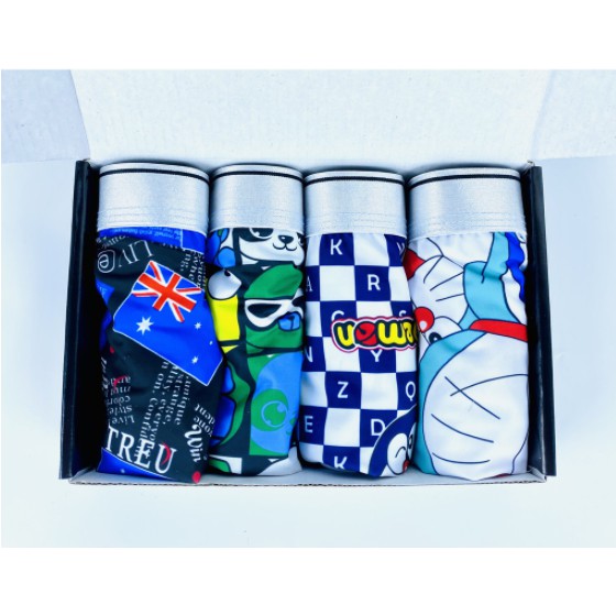 Giới thiệu Hộp 4 quần sịp chéo họa tiết hoạt hình, chất liệu thun lạnh, thông hơi thoáng mát, giao hình ngẫu nhiên