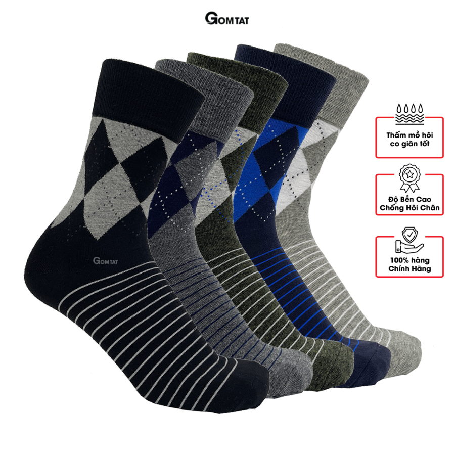 Hộp 5 đôi tất nam cổ cao công sở GOMTAT cao cấp mẫu MIX07, chất liệu cotton mềm mại, hút ẩm thoáng khí - GOM-MIX07-CB5: Là loại vớ nam cổ cao với tone màu đầy phong cách, rất dễ để phối với giày thể thao, hoặc giày tây công sở, chất liệu cotton khử mùi thoáng khí, êm ái khi sử dụng.