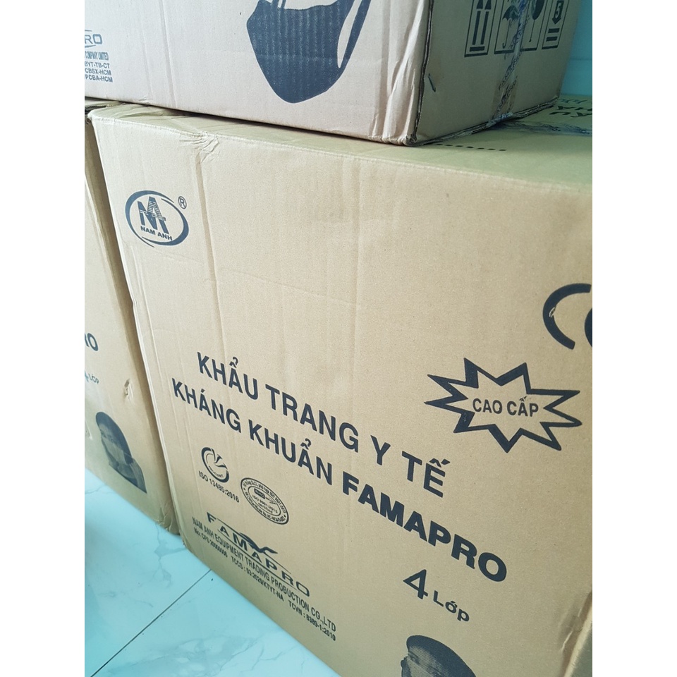 Quy cách hộp = 50 cái Màu sắc: xanh, xám, trắng, hồng, đen ------- * NAM ANH - là đơn vị sản xuất khẩu trang thương hiệu FAMAPRO chất lượng tốt. Thương hiệu đã đồng hành với nhiều người tiêu dùng trước và trong mùa dịch covid. * Sản phẩm đạt chứng nhận ISO 9001/ISO 13485. * Đạt tiêu chuẩn CE (Châu Âu), FDA (Mỹ) đảm bảo lưu hành tại thị trường Châu Âu, Châu Mỹ * Đạt chứng nhận chỉ số lọc khuẩn BFE lên đến 99% giúp lọc vi khuẩn, virus và lọc bụi mịn hiệu quả.