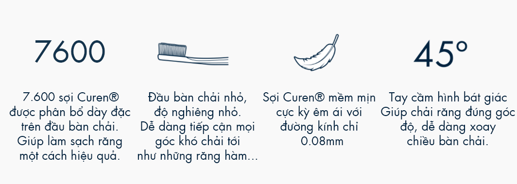 Với 5460 sợi CUREN đường kính 0.10mm (mỏng và nhiều sợi hơn gấp 10 lần so với bàn chải thông thường), bao phủ dày đặc trên đầu bàn chải giúp làm sạch mảng bám hiệu quả mà không gây đau hay tổn thương nướu răng.