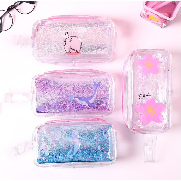 Hộp bút nhũ trong suốt có kim tuyến chuyển động kèm sticker siêu cute, Túi đựng bút size to tiện dụng