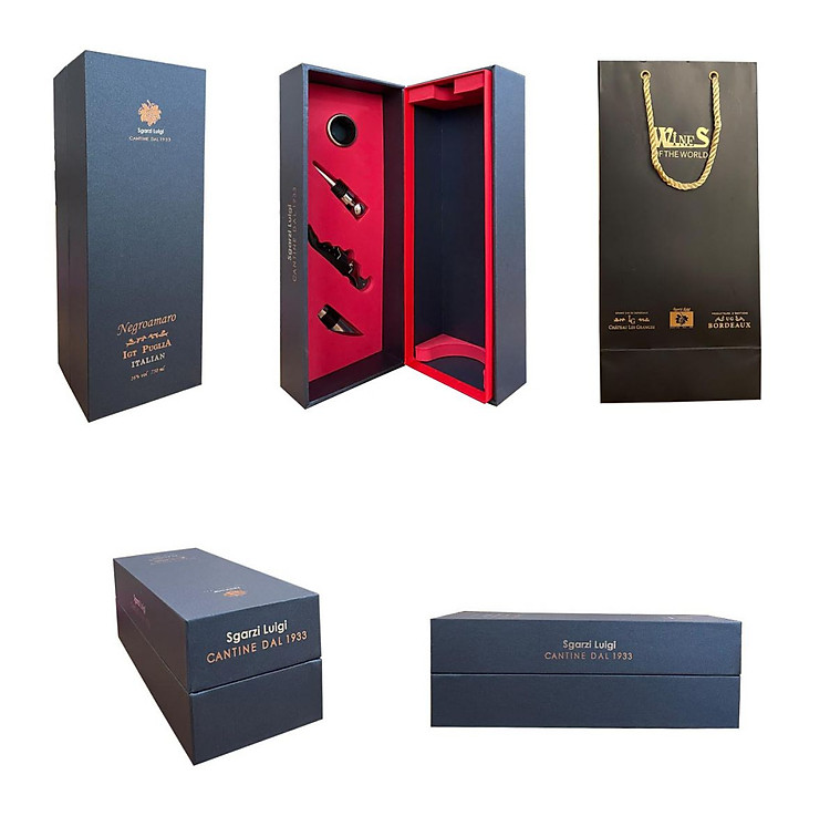 ● Set quà tặng 1 chai rượu vang kèm phụ kiện được trau chuốt tỉ mỉ từ vỏ hộp cho đến cách thể hiện bên trong với lối thiết kế theo phong cách cổ điển nhưng không kém phần hiện đại.