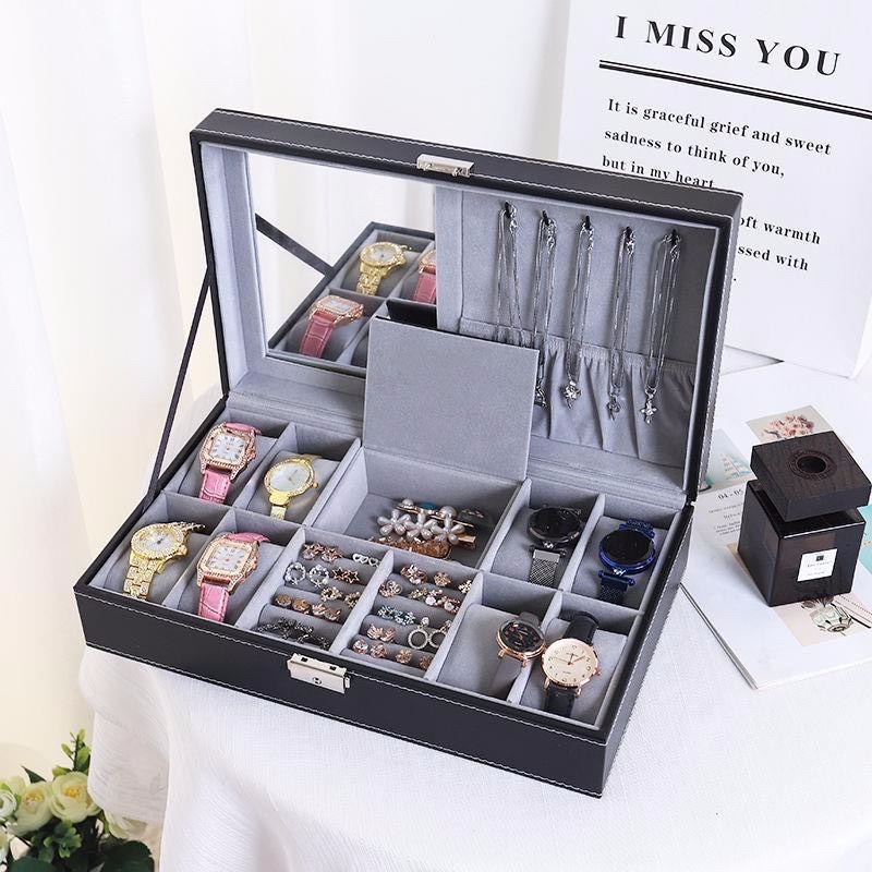 - Hộp có nắp kín, sẵn cục mút để đồng hồ, có khóa chìa, có gương soi.