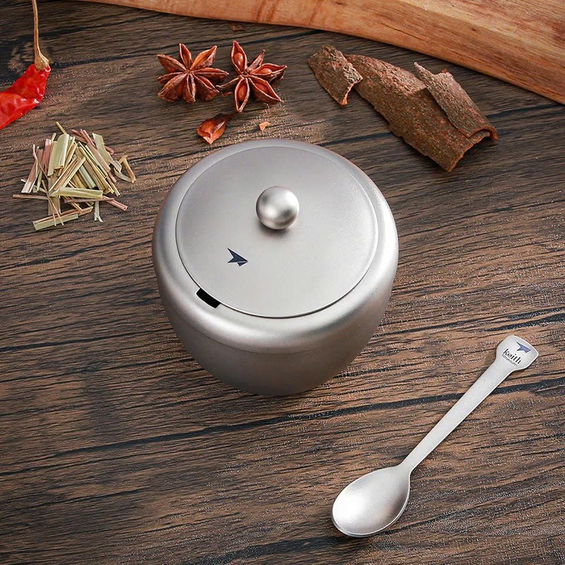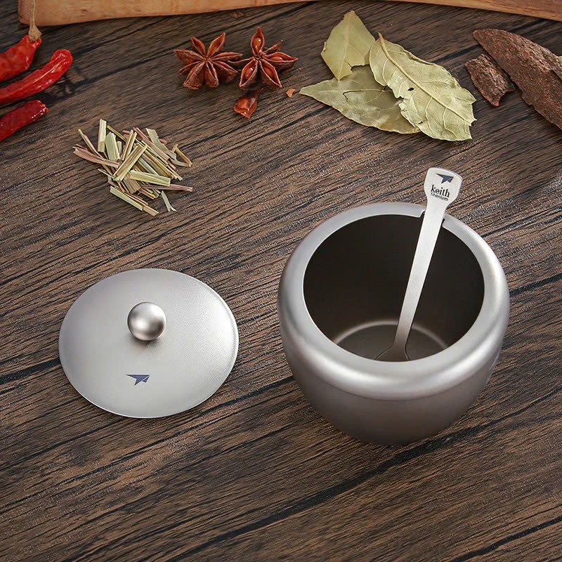 Thiết kế thông minh: một hủ và một thìa có nắp đậy, nắp titan nguyên chất chống bụi và côn trùng, giảm thiểu hiệu quả độ ẩm của gia vị;