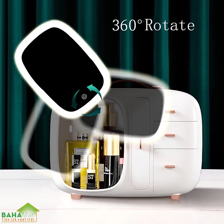 Tính năng: 1. Thiết kế tay cầm dễ dàng mang đi di chuyển, chống bám bụi và chống thấm nước, 2. Có gương trang điểm riêng biệt và dễ thương. 3. Sạc USB tiện lợi cung cấp điện, gương mở xoay 360 ° phần nắp xoay dễ dàng bao quanh gió, ánh sáng ĐÈN LED vô cấp Dimming, 4. Hộp chống bám bụi và chống thấm nước. 5. Có quạt thổi để làm khô lớp trang điểm giảm bóng dầu trên da. 6. Thích hợp cho trang điểm nhẹ nhàng và dày. trang điểm màu sắc chân thật, ánh sáng đồng đều, ánh sáng dịu nhẹ mà không chói, độ nét trong gương cao có thể điều chỉnh độ sáng theo ý muốn, tự do điều chỉnh ánh sáng theo nhu cầu, chăm sóc da và trang điểm dễ dàng hơn. 7. Có nhiều ngăn lưu trữ, có thể đựng mỹ phẩm, phụ kiện, dụng cụ làm móng, v. v. 8. Tay cầm tinh tế, đẩy và kéo êm ái, không bị bám bẩn, tiện lợi để mở và đóng, 9. Có thể để trong tủ quần áo, trong phòng tắm, ngăn kéo, phòng ăn, phòng khách, phòng lưu trữ, ban công, phòng làm việc, bàn làm việc, phòng ngủ, phòng tắm, bàn trang điểm.