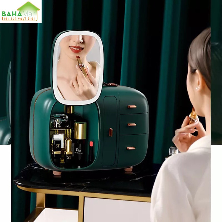 HỘP ĐỰNG MỸ PHẨM VÀ TRANG SỨC CÓ GƯƠNG TRANG ĐIỂM TÍCH HỢP ĐÈN LED "BAHAMAR" Thiết kế tay cầm dễ dàng mang đi di chuyển, chống bám bụi và chống thấm nước. Có gương trang điểm riêng biệt và dễ thương.