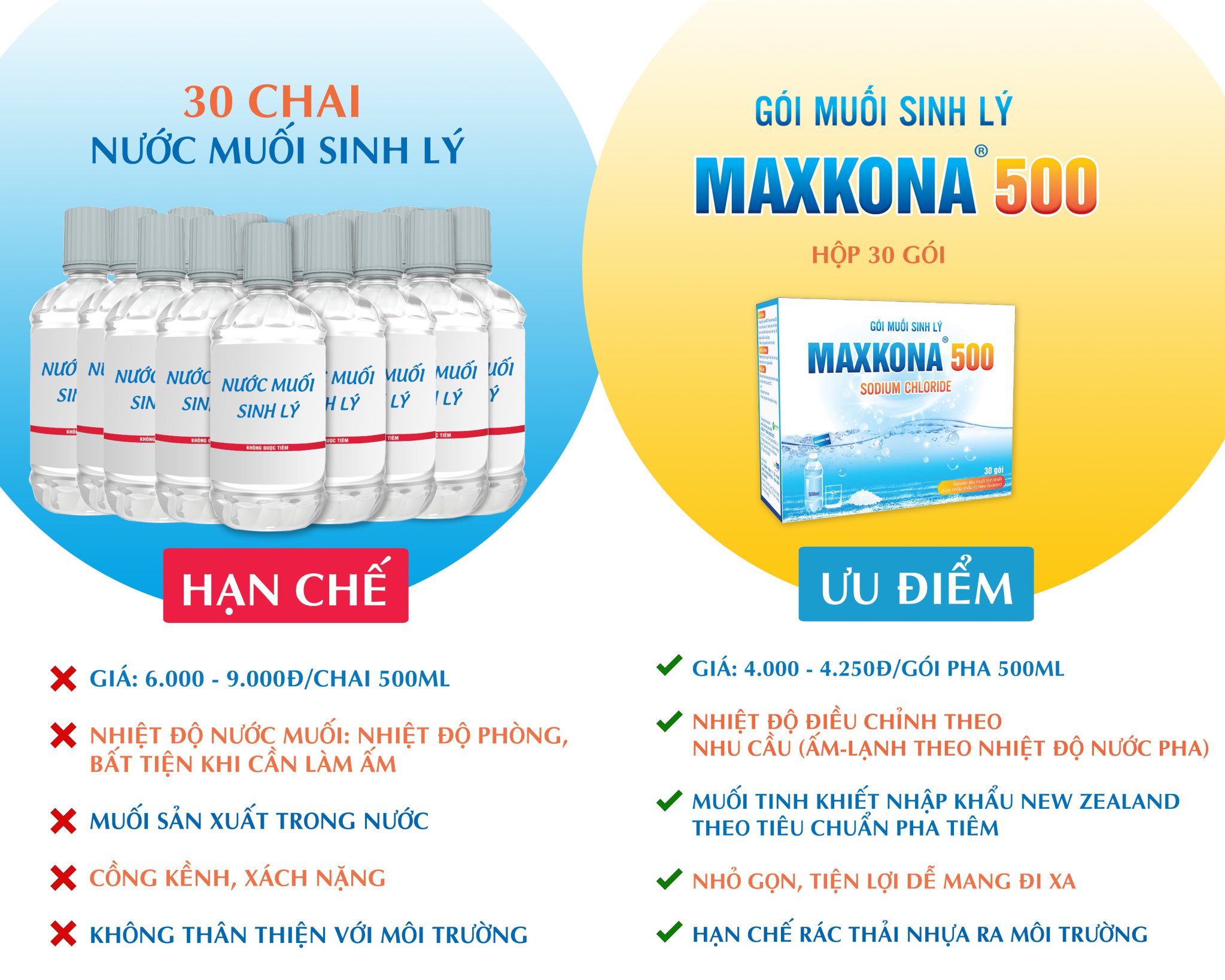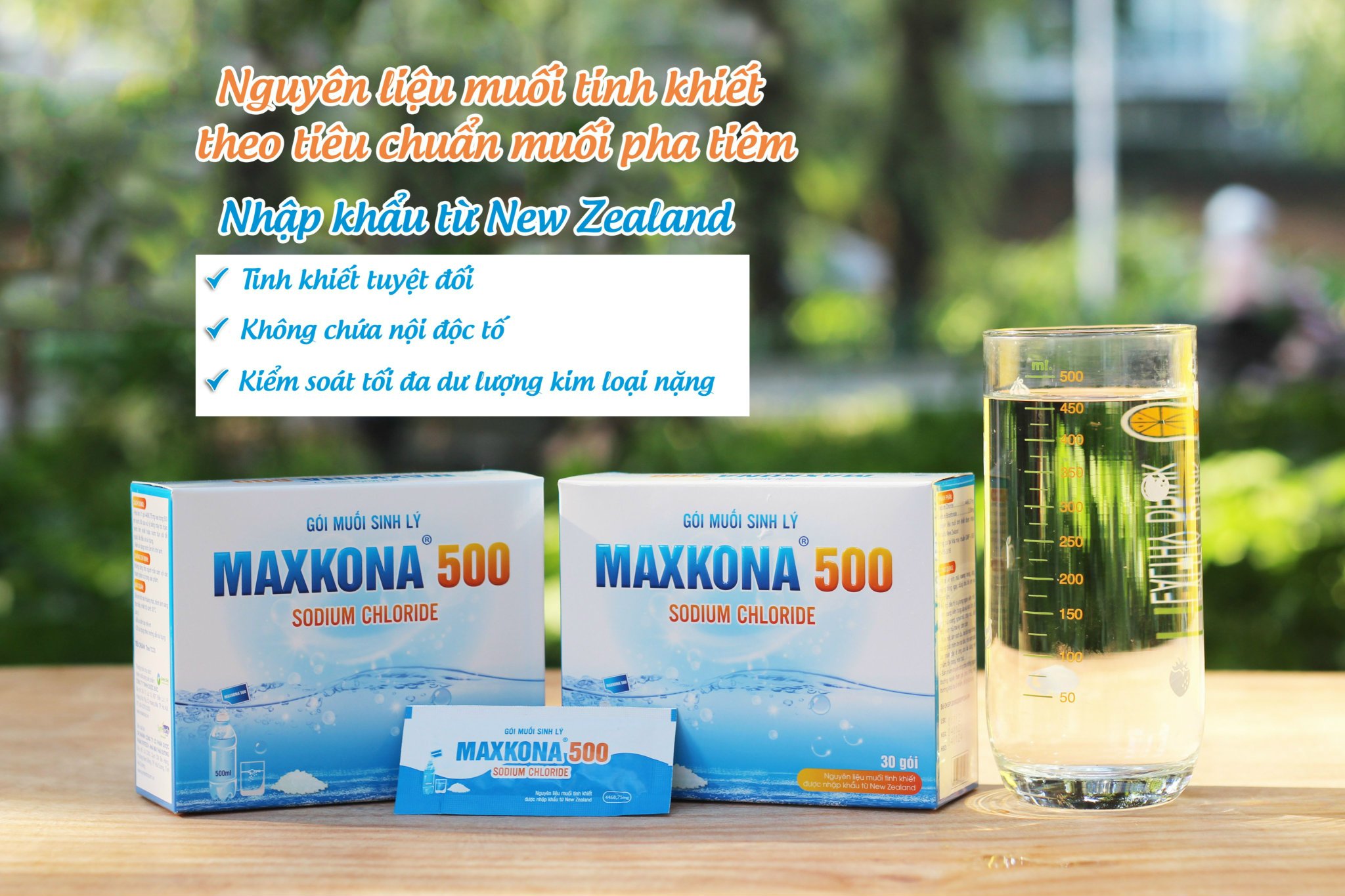- Hòa tan 01 gói muối sinh lý Maxkona 500 vào 500ml nước đã qua xử lý bằng máy lọc hoặc nước tinh khiết hoặc nước đun sôi để nguội sau đó hòa tan và sử dụng.