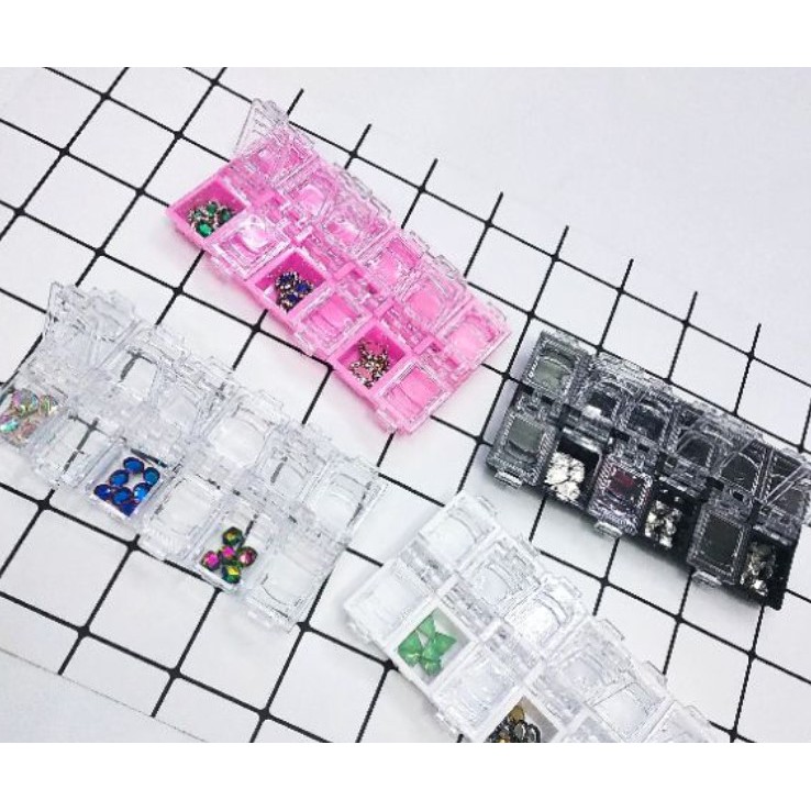 - Hộp nhựa đựng phụ kiện nail là sản phẩm chuyên dụng của ngành nails. Hộp nhựa có 12 ô nhỏ dùng để đựng đá, charm, phụ kiện nail,...