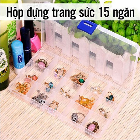 - Hộp 15 ngăn:Kích thước: 17 x 10 cm, dày 2,2 cm có nút đóng mở. Kích thước mỗi ô nhỏ: 3,3cm x 3,5cm