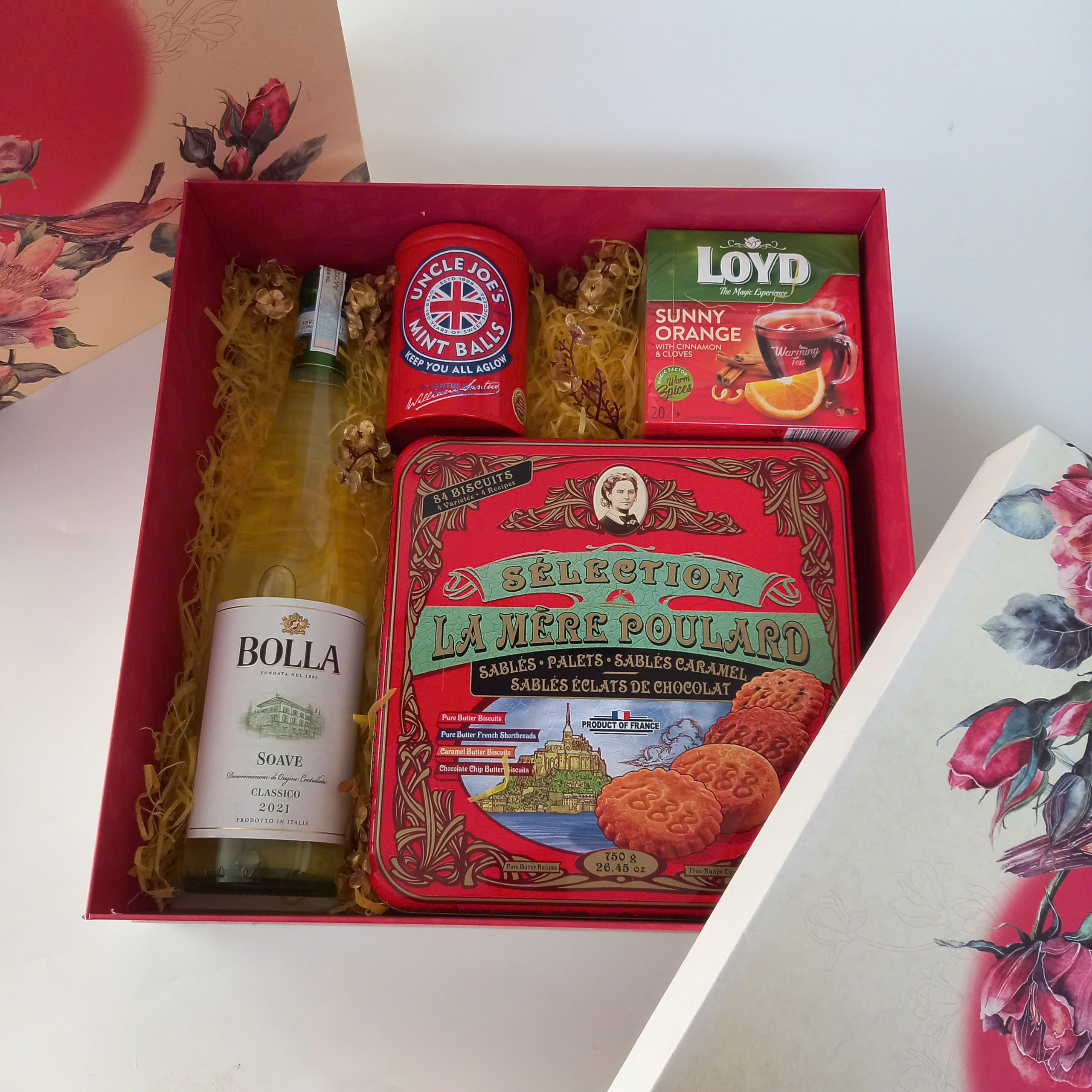 Thành phần | Hộp quà Sài Gòn Gourmet này được trao tới người nhận với các sản phẩm :+Vang Trắng Italy BOLLA SOAVE CLASSICO 750mlNHÀ VANG: BollaVÙNG: Veneto - ItalyNỒNG ĐỘ:13%GIỐNG NHO: Garganega và Trebbiano di SoaveLOẠI: Vang trắng+Trà LOYD 40g sunny orangeTrà cao cấp Ba Lan đậm vị thơm từ trái cam mọng nước.Xuất xứ: Ba LanQuy cách đóng gói: Hộp gồm 20 túi trà ( 2g/túi)+Bánh quy- La Mère Poulard - Sablés ESclats De Chocolat(4Varieties) 750gBrand: La Mere PoulardMã sản phẩm:BMP0803-303Xuất xứ: PhápQuy cách đóng gói: 750g+ Kẹo Bạc Hà UNCLE JOE'S MINI BALLS 90gBrand: Uncle Joe'sMã sản phẩm: TB50768Xuất xứ: Vương Quốc AnhQuy cách đóng gói: 9g+ Hộp quà cao cấp Sài Gòn GourmetBrand: Sài Gòn GourmetMã sản phẩm: HQSGGM012025Xuất xứ: Việt Nam+ Hoa trang trí, nơ, thiệp chúc tết |