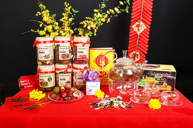 | Thành phần | ( Năm 2022 - 2030 vỏ lọ được thay thế bằng lọ thủy tinh, sang trọng hơn, chất lượng hơn)01 Lọ trà sâm dứa hoa nhài cao cấp01 Lọ sơn mật hồng sâm cao cấp01 Lọ mác ca cao cấp01 Lọ mận khía cao cấp01 Lọ sấu giòn cao cấp01 Hộp quà sang trọng, lịch sự |