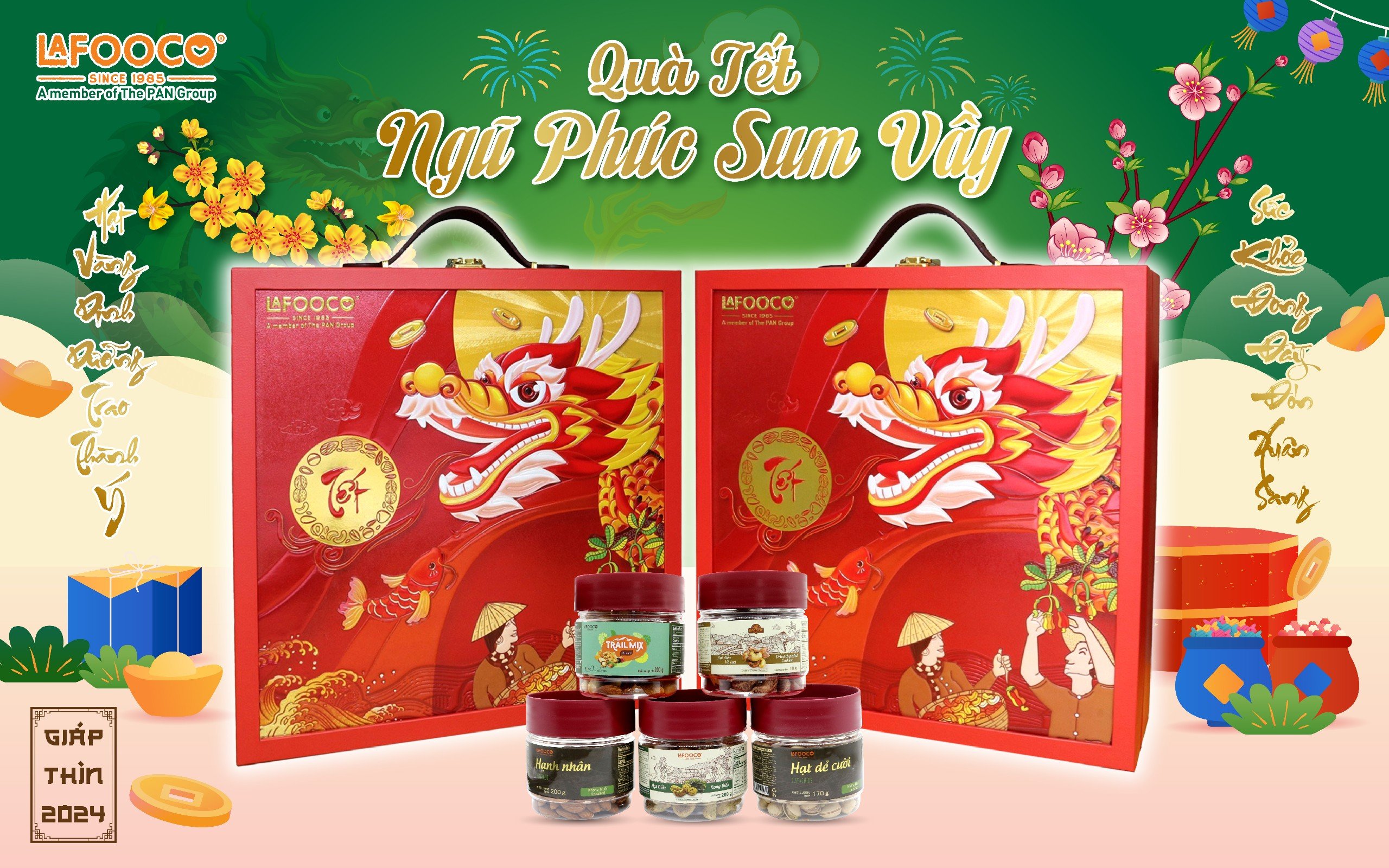 Hộp quà NGŨ PHÚC SUM VẦY trân trọng mang đến cho Quý Khách Hàng/Đối Tác 05 loại sản phẩm Hạt Dinh Dưỡng chất lượng, hội tụ tinh hoa từ khắp nơi trên thế giới là một món quà sức khỏe, trao tặng nhau yêu thương và sự trân quý, hộp quà gồm:
