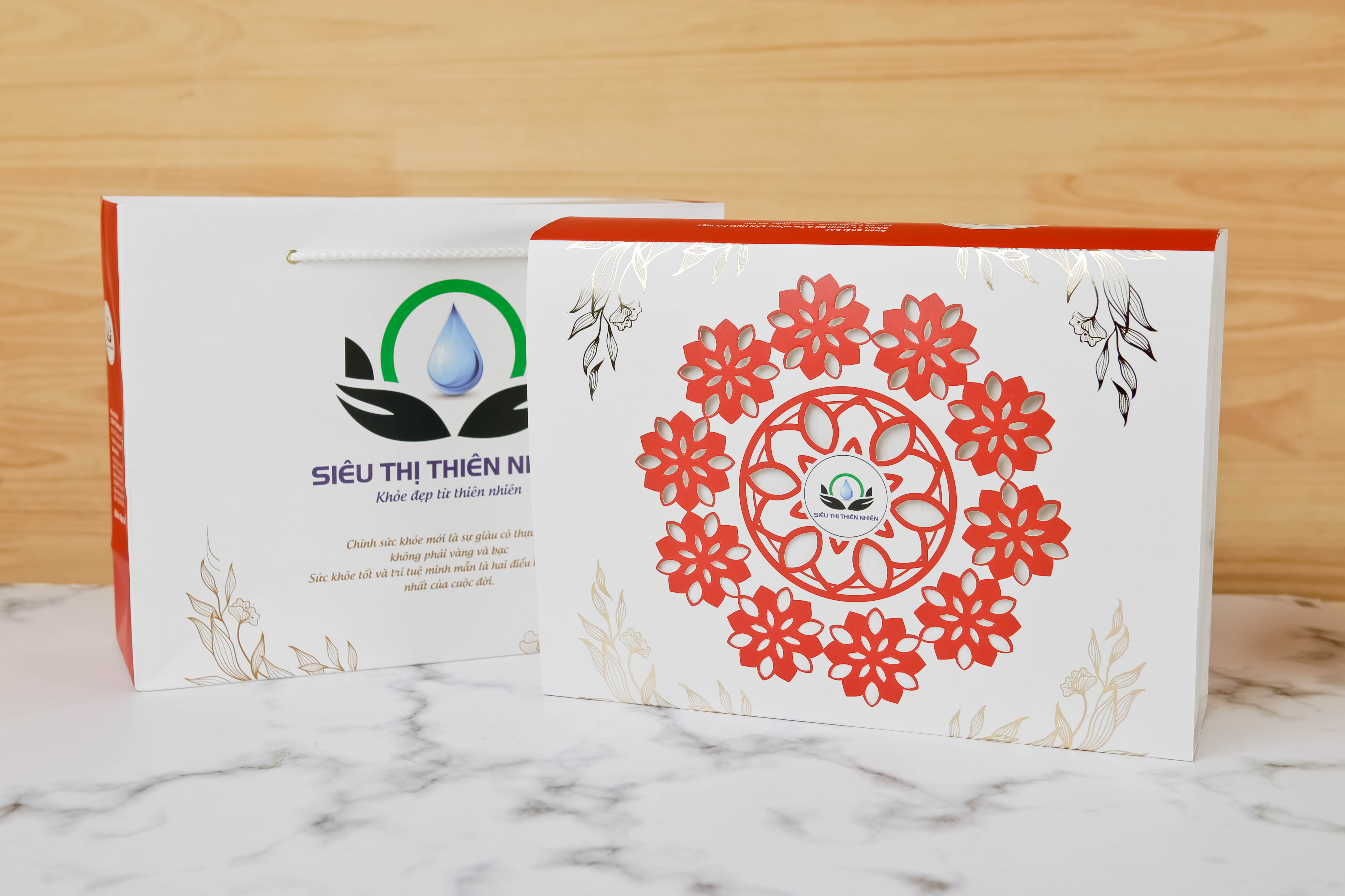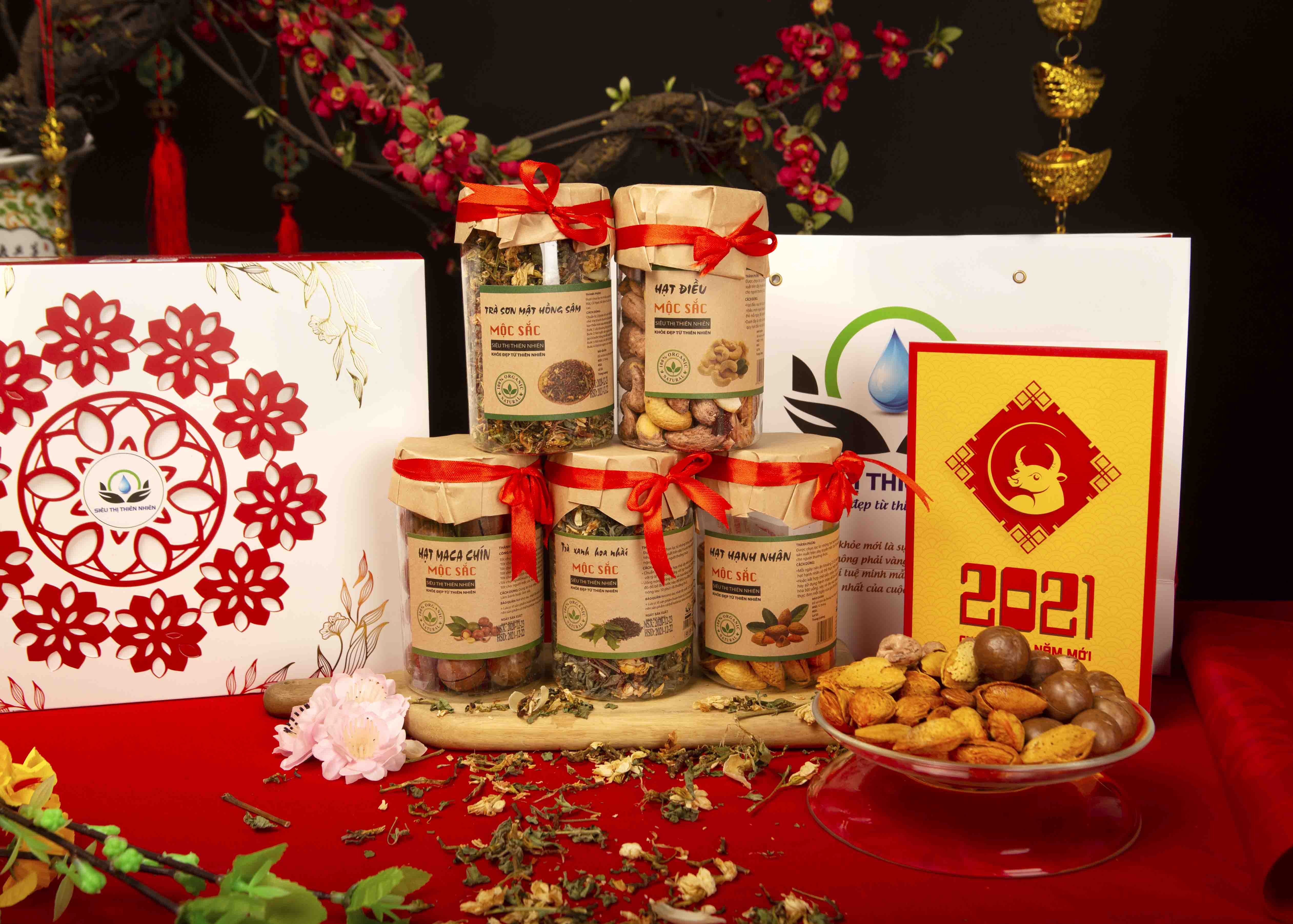 Thành phần | ( Năm 2022 - 2030 vỏ lọ được thay thế bằng lọ thủy tinh, sang trọng hơn, chất lượng hơn)01 lọ trà xanh hoa nhài01 lọ trà sơn mật hồng sâm01 lọ hạt điều cao cấp01 lọ hạt hạnh nhân cao cấp01 lọ hạt mác ca cao cấp |
