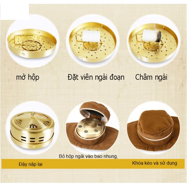 - Hộp đựng ngải đồng tròn đẹp, ít khói được đúc chế tinh xảo- Bao nhung dày dặn, mượt mà có đai điều chỉnh cấp độ khi thít đai đảm bảo không phỏng, không khói.