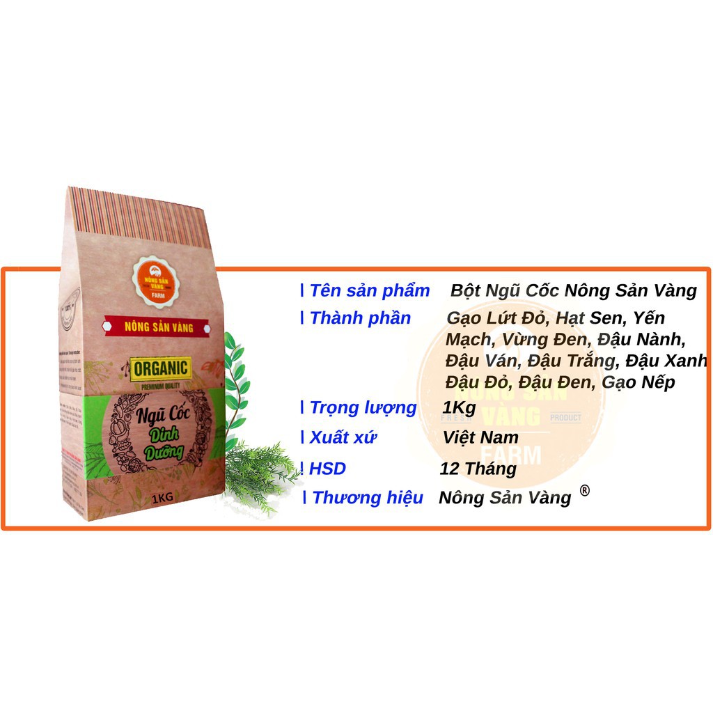 Thương hiệu Nông Sản Vàng Tên Sản Phẩm: Bột Ngũ Cốc 1kg Xuất xứ: Việt Nam (Nông Sản Vàng) Trọng lượng : 1kg Đơn Vị SX: Công Ty TNHH TM Nông Sản Vàng HSD: 12 tháng từ ngày sản xuất Xuất xứ: Việt Nam Công ty TNHH Nông Sản Vàng đảm bảo sản phẩm 100% từ hạt ngũ cốc nguyên chất, sạch, - Quý khách được miễn phí đổi trả khi sản phẩm bị lỗi bao bì hoặc không đúng cam kết của công ty. - Công dụng: Bổ sung đầy đủ dinh dưỡng, tăng cường sức đề kháng, có thể sử dụng cho bé ăn dặm, phù hợp với khách hàng có chế độ ăn kiêng, giúp giảm cân. Sản phẩm giúp lợi sữa, nâng cao chất lượng sữa, tăng vòng 1.... bổ sung thêm đường và sữa vào ly ngũ cốc khi pha chế giúp người gầy tăng cân ********************************** BỘT NGŨ CỐC ĂN KIÊNG NÔNG SẢN VÀNG - Ngũ cốc được biết đến là thực phẩm rất tốt cho sức khỏe bởi lượng cellulose trong ngũ cốc có thể ức chế sự hấp thụ cholesterol, giúp giảm mỡ trong máu, kích thích đông ruột, ngăn ngừa táo bón. Một số loại ngũ cốc còn có giá trị dược liệu như kiều mạch có chứa “chất diệp lục” và “rutin” giúp điều trị huyết áp cao. _________________ Nên sử dụng bột ngũ cốc nào để đạt hiệu quả giảm cân? - Bột ngũ cốc NÔNG SẢN VÀNG là sản phẩm được phối hợp từ các loại ngũ cốc: gạo lức, đậu nành (đậu tương), yến mạch, vừng đen ( Mè đen), ngô, đậu xanh, đậu đỏ, đậu đen. - Sản phẩm chứa nhiều loại Vitamin và khoáng chất như chất đạm, Vitamin B1, B2, PP, C, E… không những cung cấp đầy đủ năng lượng cho hoạt động hàng ngày mà còn hỗ trợ làm đẹp da và tăng sức đề kháng. - Lượng chất xơ cao trong sản phẩm không chỉ giúp bạn cải thiện hệ tiêu hóa, điều trị táo bón mà còn giúp bạn cảm giác no lâu làm giảm lượng thức ăn hàng ngày. Lượng chất béo đủ để cung cấp cho hoạt động hằng ngày sẽ không dư thừa gây tích tụ thành mỡ dư trong cơ thể. Giảm cân bằng bột ngũ cốc là liệu pháp khá đơn giản và mang lại hiểu quả rất tốt. _____________________ Nên dùng bột ngũ cốc NÔNG SẢN VÀNG như thế nào để giảm cân?