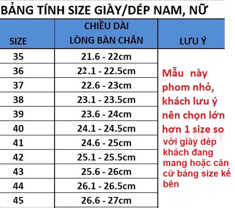 BẢNG TÍNH SIZE: MẪU NÀY PHOM NHỎ, KHÁCH NÊN CHỌN LỚN HƠN 1 SIZE SO VỚI GIÀY ĐANG MANG HOẶC CĂN CỨ THEO BẢNG SIZE SAU: