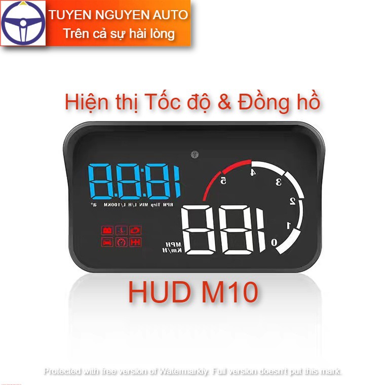 *CHỨC NĂNG HOẠT ĐỘNG: M10 hiển thị 3 mục 1.HUD M10 hiến thị tốc độ hắt kính 2.Hiển thị vòng tua máy hình vòng cung và số (có thể tắt, bật hiển thị tùy ý) 3.Hiển thị thêm hàng số có màu xanh hoặc vàng (đồng hồ, hoặc mức tiêu hao nhiên liệu, odo, thời gian di chuyển, số kilomet di chuyển trong thời gian đó, v.v) Mục đích hỗ trợ lái xe an toàn hơn, một tính năng thường chỉ có trên những dòng xe cao cấp. (đặc biệt thiết kế có viền chắn chống chói mắt)