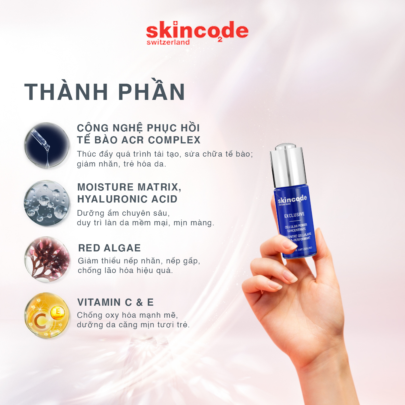- Tên sản phẩm: Huyết thanh phục hồi và trẻ hóa da cấp tốc Skincode Exclusive Cellular Power Concentrate.