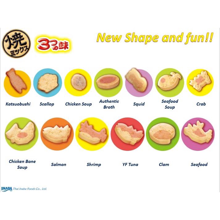 ---Xuất xứ: Nhật Bản ---Nhà sản xuất: Thai Inaba Foods Company Limited ---Trong mỗi gói sẽ bao gồm 2 hương vị -Cá & Sò điệp -Sò điệp & Cua -Tôm & Hải sản -Cá ngừ & Thịt gà -Nước thịt & Mực