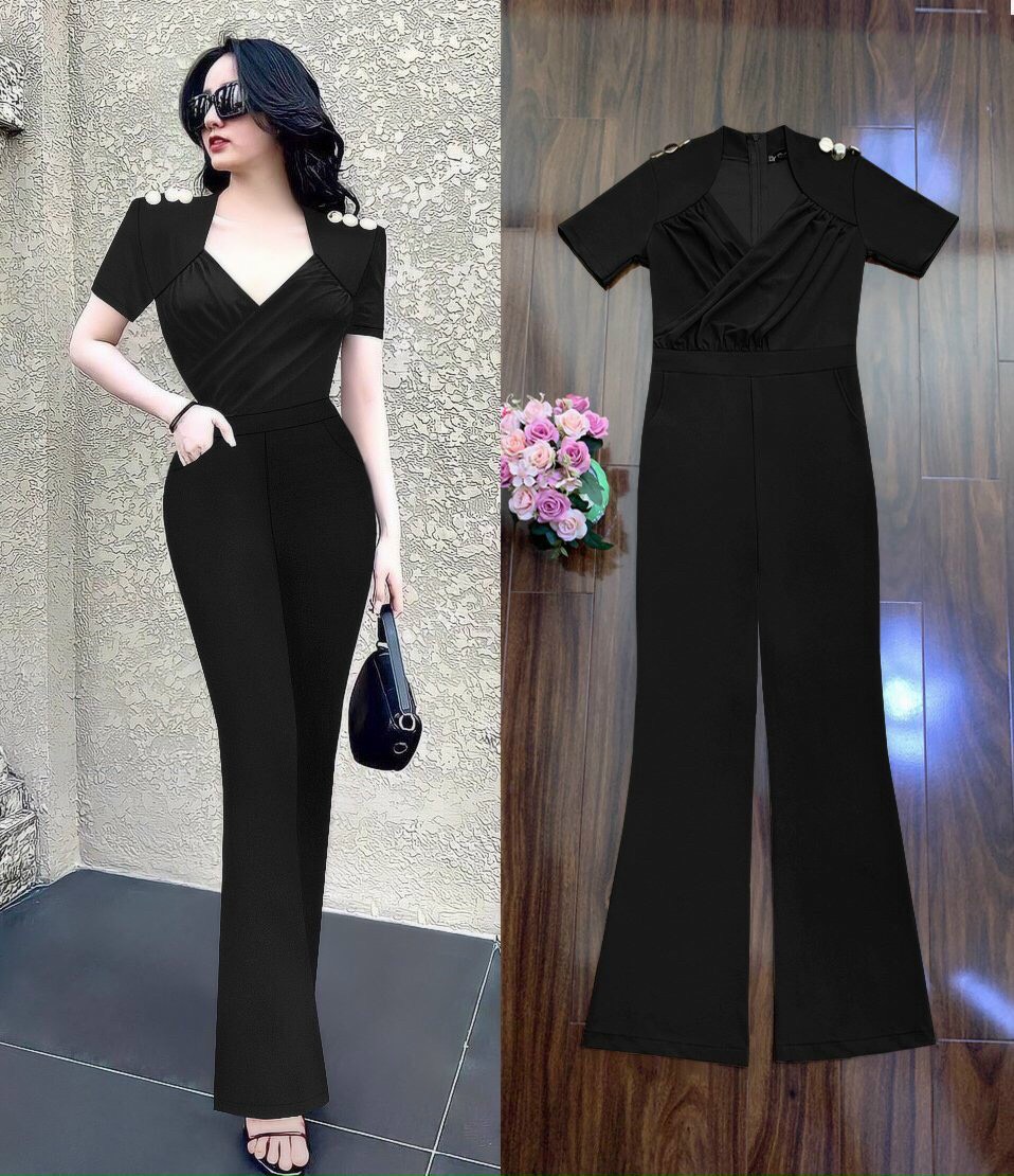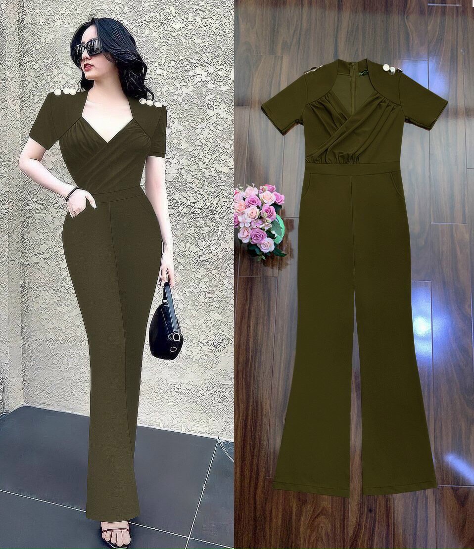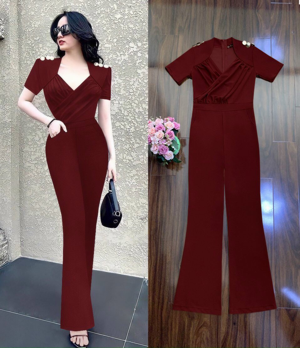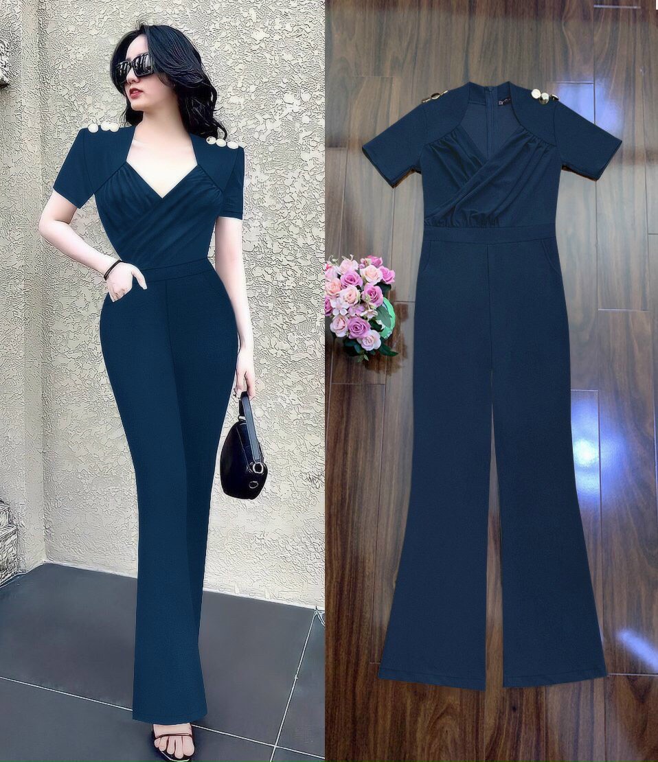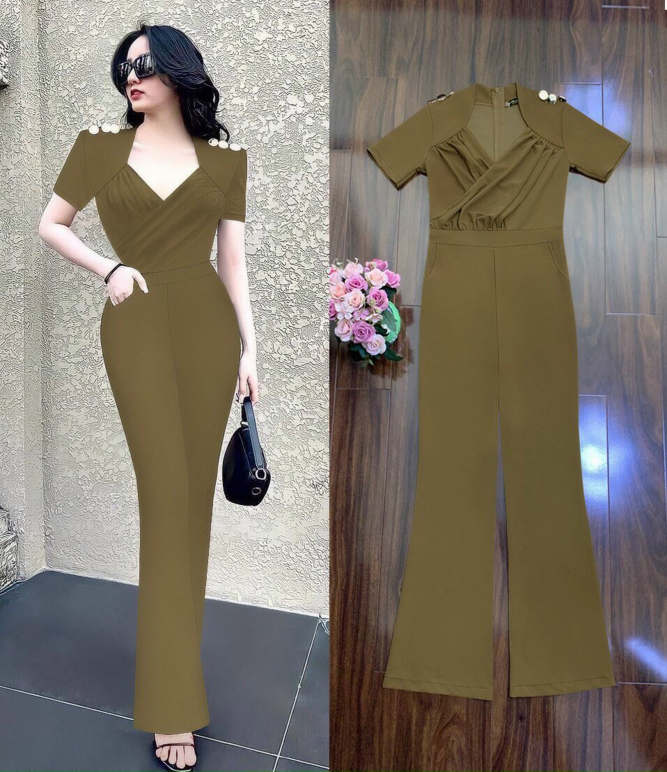 Jum dài ống loe xếp ly ngực vai phối nút xinh xắn