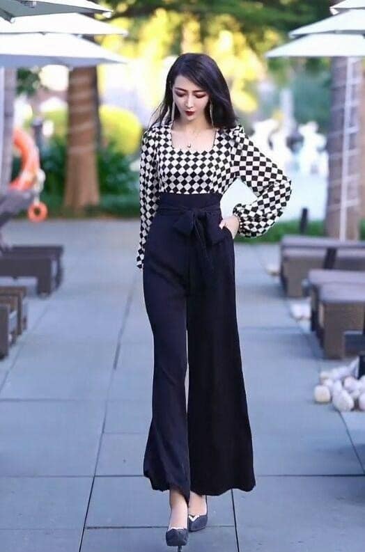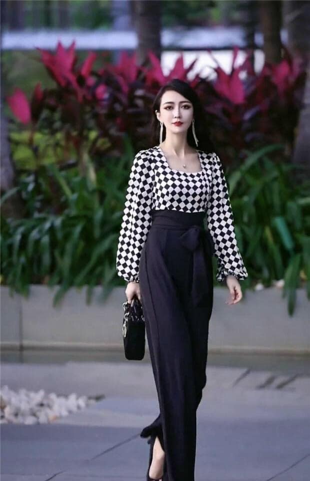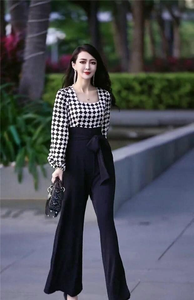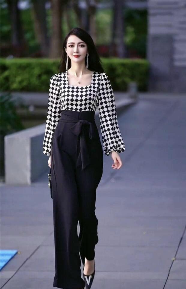 Jumpsuit lụa phối caro tay phồng