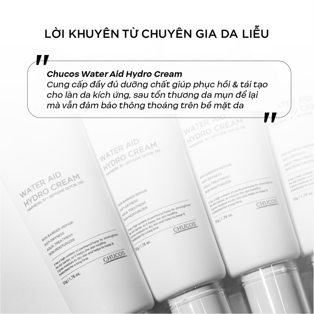 - Lời khuyên từ chuyên gia da liễu Chucos: "Chucos Water Aid Hydro Cream cung cấp đầy đủ dưỡng chất giúp phục hồi và tái tạo cho làn da kích ứng, sau tổn thương da mụn để lại mà vẫn đảm bảo sự thông thoáng trên bề mặt da.“