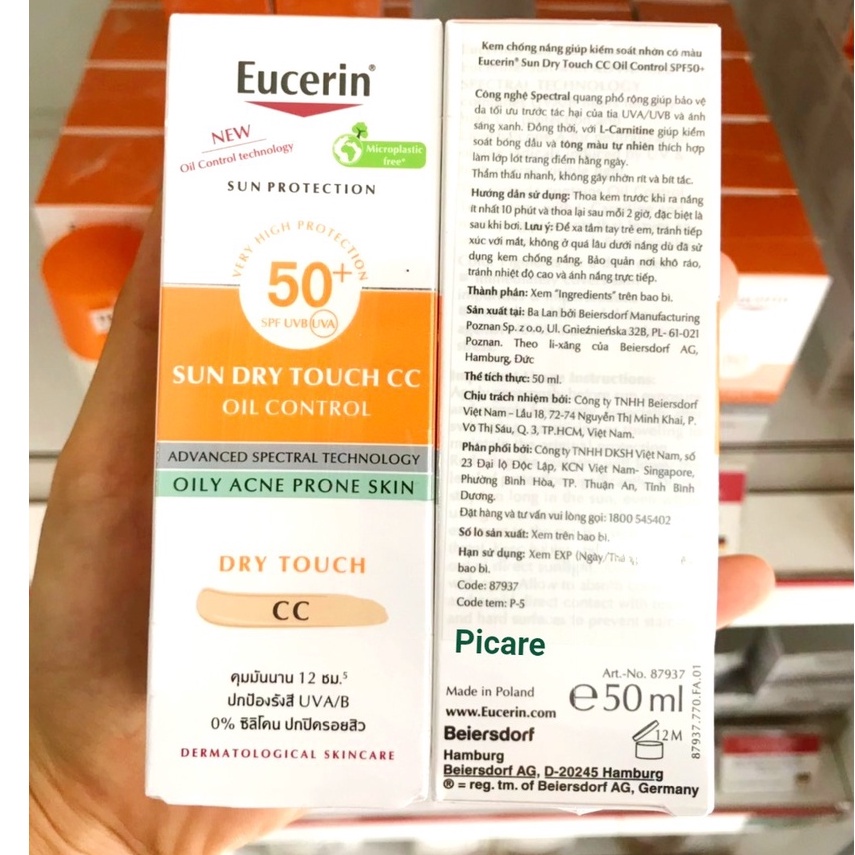 1. Công dụng - Kem Chống Nắng Kiểm Soát Nhờn Eucerin Sun Oil Control Dry Touch CC SPF50+ có tác dụng giúp chống nắng cao và với lớp nền che khuyết điểm. - Ngăn ngừa sự xâm hại của tia UVA/UVB giúp da luôn được khỏe mạnh, trắng sáng - Sản phẩm được nghiên cứu đặc biệt dành cho làn da nhờn, dễ mụn có tác dụng giảm nhờn, giảm mụn hiệu quả - Giúp các vết sạm, nám trên da được làm mờ nhanh chóng - Kết cấu nhẹ, khô thoáng.