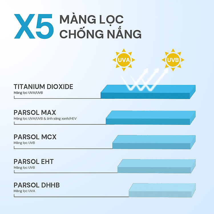 Hệ lọc UV tiên tiến từ châu Âu (Parsol EHT, MCX, DHHB, MAX):