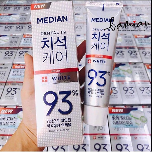 Kem đánh răng MEDIAN Hàn Quốc - Kem đánh răng Median 93% là loại kem tốt được các NHA SĨ trên thế giới KHUYÊN DÙNG với chất kem rất đặc nên dùng tiết kiệm vô cùng! . - Tác dụng: + Làm trắng răng, giúp loại bỏ các vết bẩn bám trên răng + Loại bỏ vôi răng, chống viêm nướu, viêm lợi, các bệnh răng miệng + Tẩy sạch cao răng và giúp răng trở nên trắng sáng hơn trong thời gian ngắn nhất! + Giúp ngăn ngừa sâu răng và đem lại hơi thở thơm mát.