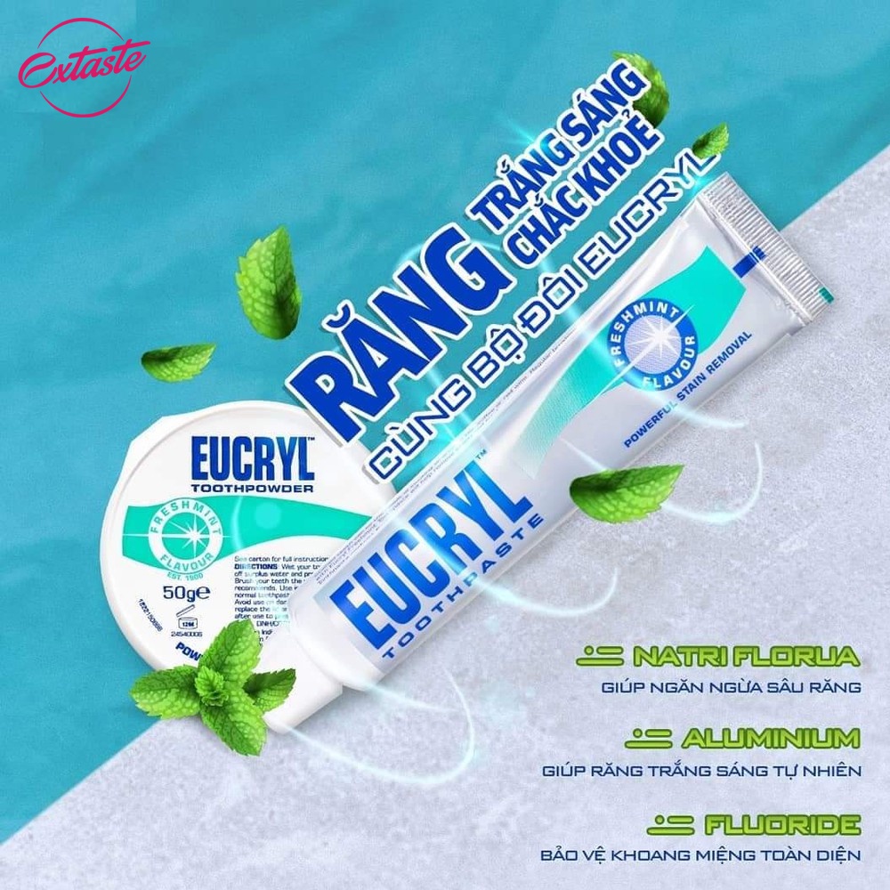 CÔNG DỤNG KEM ĐÁNH RĂNG TRẮNG SÁNG EUCRYL TOOTHPASTE - Kem đánh răng tẩy trắng Eucryl Toothpaste 62g mang đến cho bạn hơi thở thơm mát và nụ cười trắng sáng tự nhiên. - Khi sử dụng kem đánh răng Eucryl các viên bột li ti sẽ đi sâu vào kẽ răng của bạn, lấy đi những vết dơ do thức ăn để lại, giúp răng trắng sáng hơn các loại kem đánh răng thông thường. - Kem đánh răng Eucryl giúp khắc phục vết thuốc lá, trà, cà phê và thậm chí là vết rượu vang đỏ, và làm cho răng của bạn trông sạch sẽ, mịn màng và tươi sáng và thơm miệng với hương bạc hà tươi mát. - Kem đánh răng có thể được sử dụng hàng ngày như một chất tẩy vết bẩn nhẹ nhàng, giúp răng được đánh bóng và bảo vệ khỏi sâu răng.