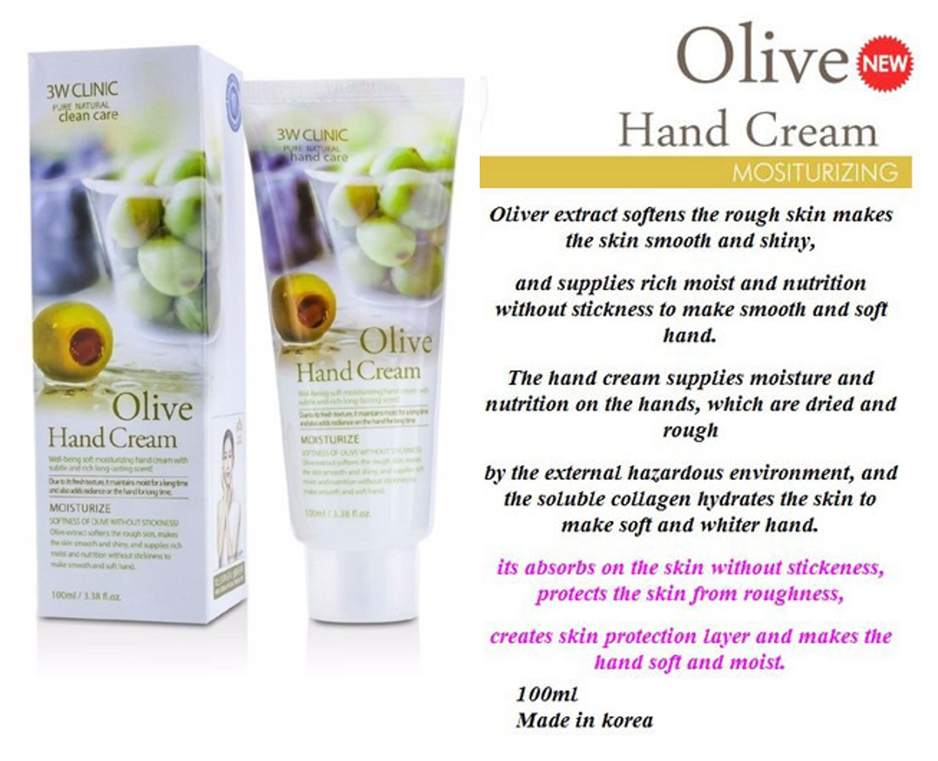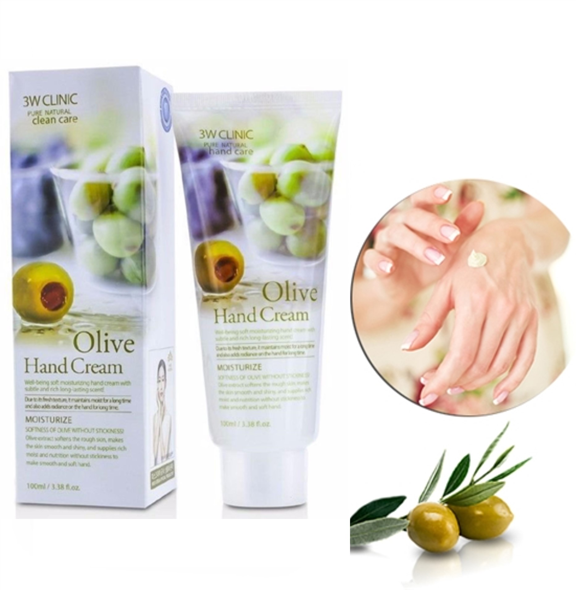 - Kem Dưỡng Da Tay 3W Clinic Chiết Xuất Olive chứa chiết xuất từ ốc sên, Olive, thảo mộc, các loại vitamin cho da tay luôn mềm mại và mịn màng.