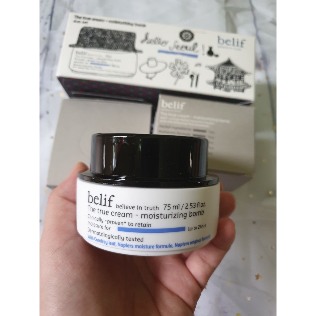 💦Kem dưỡng ẩm Belif cực kì được yêu thích tại Hàn Quốc. Lý do có thể nằm ở kết cấu dạng kem nhẹ nhanh chóng ngấm vào da. Thành phần chính được chiết xuất từ lá của cây hoa chuông(Comfrey) có tác dụng thúc đẩy quá trình tái tạo da, giảm viêm, se vết thương, cung cấp độ ẩm cần thiết (duy trì tới 26 giờ) giúp da hết bong tróc và trở nên mịn màng hơn; Red Clover (cỏ 3 lá đỏ), Marigold (cúc vạn thọ) cung cấp độ ẩm siêu việt cho làn da khô sần.The true cream – moisturizing bomb chính là kem dưỡng bổ sung ẩm siêu việt được tạo nên từ những thành phần thảo dược đó, giúp bổ sung ẩm liên tục cho da suốt 26h không ngừng nghỉ.