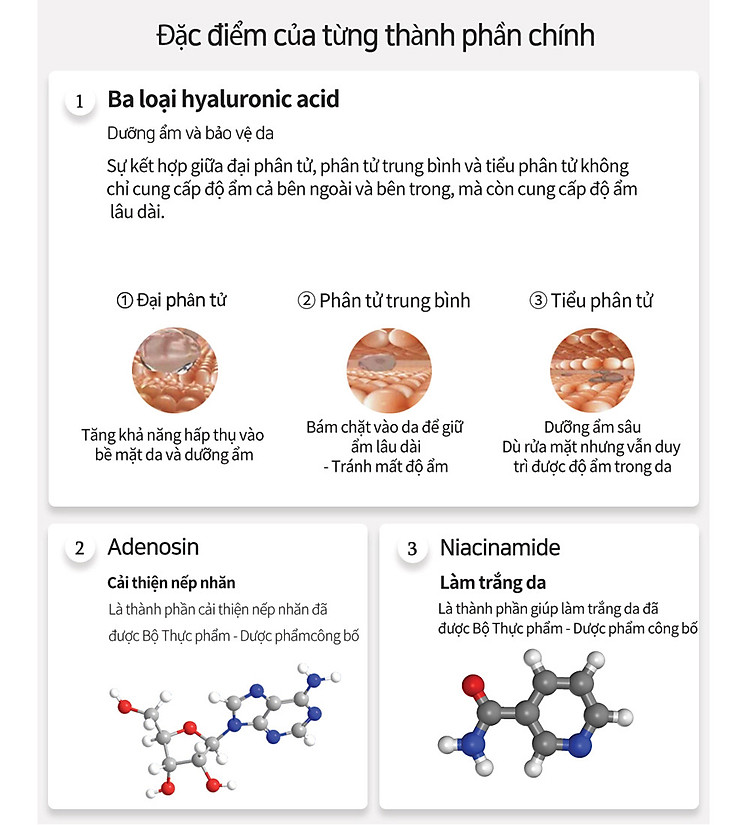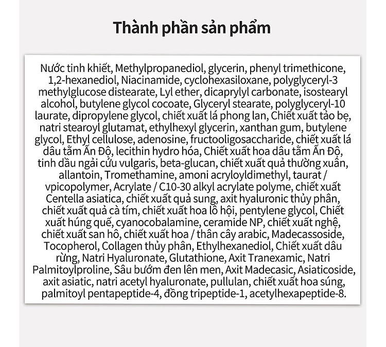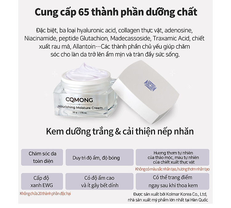 Kem dưỡng ẩm, làm trắng và cải thiện nếp nhăn CQMONG Nourishing Moisture Cream+ Trọng lượng: 50g+ Kết cấu: Mỏng nhẹ, thấm nhanh vào da.Với thành phần chiết xuất từ 65 dưỡng chất hoạt tính giúp làm sáng da, cải thiện nếp nhăn và mờ thâm. Ngoài ra, với thành phần từ HA, giúp dưỡng ẩm và chống lão hóa, thành phần từ Niacinamide giúp dườn trắng và giảm thâm, ngoài ra với các thành phần như chiết xuất rau má, chiết xuất ngải cứu giúp làm dịu da, peptides giúp làm trẻ hóa da.+ Công dụng: - Cấp ẩm, làm mịn da- Dưỡng trắng da, cải thiện sắc tố da- Giảm nếp nhăn, chống lão hóa- Làm dịu da, phục hồi da bị tổn thương+ Hướng dẫn sử dụng : Kem dưỡng là bước cuối cùng trong quy trình chăm sóc da, cho một lượng vừa đủ và thoa đều lên mặt, Massage nhẹ và vỗ nhẹ để kem thấm hoàn toàn.
