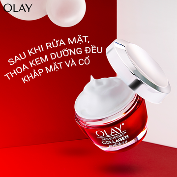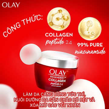 - Kem dưỡng Olay chứa phức hợp Collagen Peptide và Niacinamide giúp mang lại các hiệu quả vượt trội: làm mờ đốm nâu & thu nhỏ lỗ chân lông rõ rệt, làm giảm sự xuất hiện của nếp nhăn & rãnh nhăn, cải thiện kết cấu da mịn màng và săn chắc hơn.
