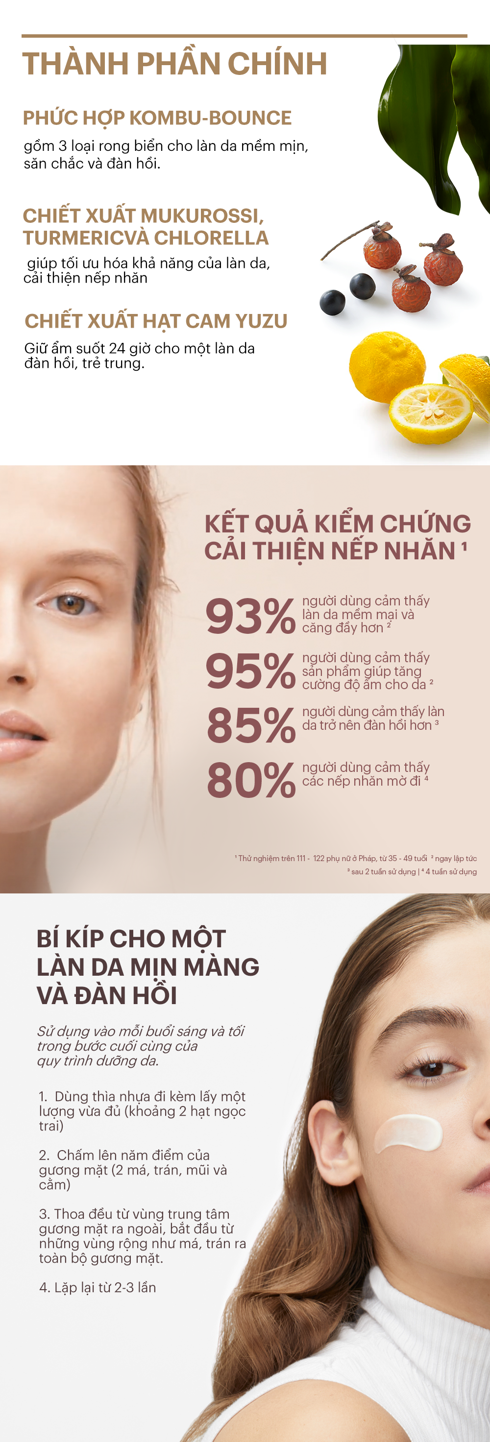 - Phức hợp KOMBU-Bounce: Công thức với tảo xanh, tảo nâu và tảo đỏ giúp giải quyết các nguyên nhân hình thành nếp nhăn
