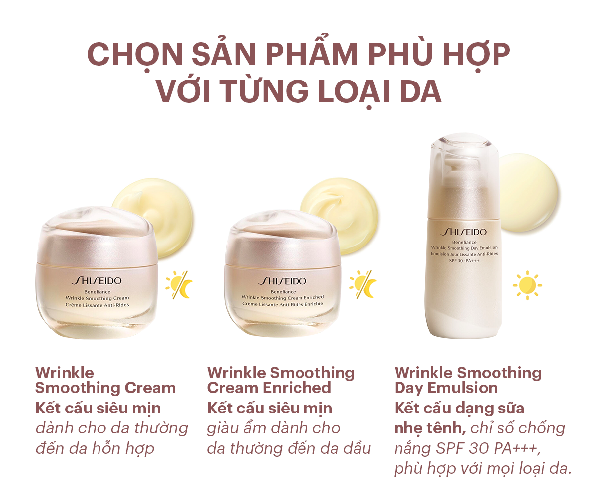 Kem dưỡng da chống lão hóa Shiseido Benefiance Wrinkle Smoothing Cream ứng dụng công nghệ ReNeura Technology+ sẽ giúp làm căng đầy những nếp nhăn, vết chân chim, đồng thời hỗ trợ phục hồi làn da đang "xuống cấp" và nuôi dưỡng chuyên sâu làn da khoẻ khoắn, trắng hồng, mịn màng. Kem dưỡng da chống lão hóa với kết cấu siêu mịn, thẩm thấu nhanh, chính là bí quyết chăm sóc da, giúp da thêm rạng rỡ, tươi tắn hơn.