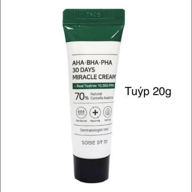 - Kem có thành phần chính từ 10.000ppm cây tràm trà tự nhiên được biết đến với khả năng giảm mụn hiệu quả, chiết xuất rau má 700000ppm - Ngoài ra nhờ chiết xuất và lên men của 4 loại thảo dược: hoa oải hương, hương thảo, kinh giới cay, cỏ xạ hương. - Và đặc biệt là bộ 3 thành phần tẩy da chết hóa học nức tiếng là AHA, BHA và PHA: + AHA – Alpha Hydroxy Acids là nhóm acid ưa nước, giúp liên kết các tế bào nên AHA phá vỡ liên kết nước này và làm bong phần da chết. Ngoài ra nó còn có khả năng chống lão hóa và săn chắc tầng biểu bì. + BHA – Beta Hydroxy Acids có thể tan trong dầu nên tác động sâu giúp loại bỏ bụi bẩn, tế bào chết cứng đầu và làm thông thoáng lỗ chân lông, giảm nguy cơ gây ra mụn. + PHA – Polyhydroxy Acids là nhóm acid lành tính nhất cũng có khả năng làm dịu da. Hơn thế, PHA còn chống oxy hóa, kích thích tế bào da tái tạo, giảm nếp nhăn và giúp da mặt khỏe, săn chắc hơn. - Some By Mi AHA-BHA-PHA 30 Days Miracle Cream giúp tăng cường sức mạnh của "hàng rào" bảo vệ da, tái tạo da, làm dịu da, loại bỏ tế bào chết. - Giúp giảm mụn, chống oxy hóa, cải thiện làn da gặp kích ứng, dưỡng sáng da và ngăn ngừa nếp nhăn. - Kem dưỡng cung cấp độ ẩm trên da, kiểm soát bã nhờn. - Kết cấu kem có dạng gel ẩm, hấp thụ vào da nhanh chóng, không gây bết dính hay bóng nhờn, không làm nặng mặt, mang lại cảm giác tươi mát khi sử dụng.
