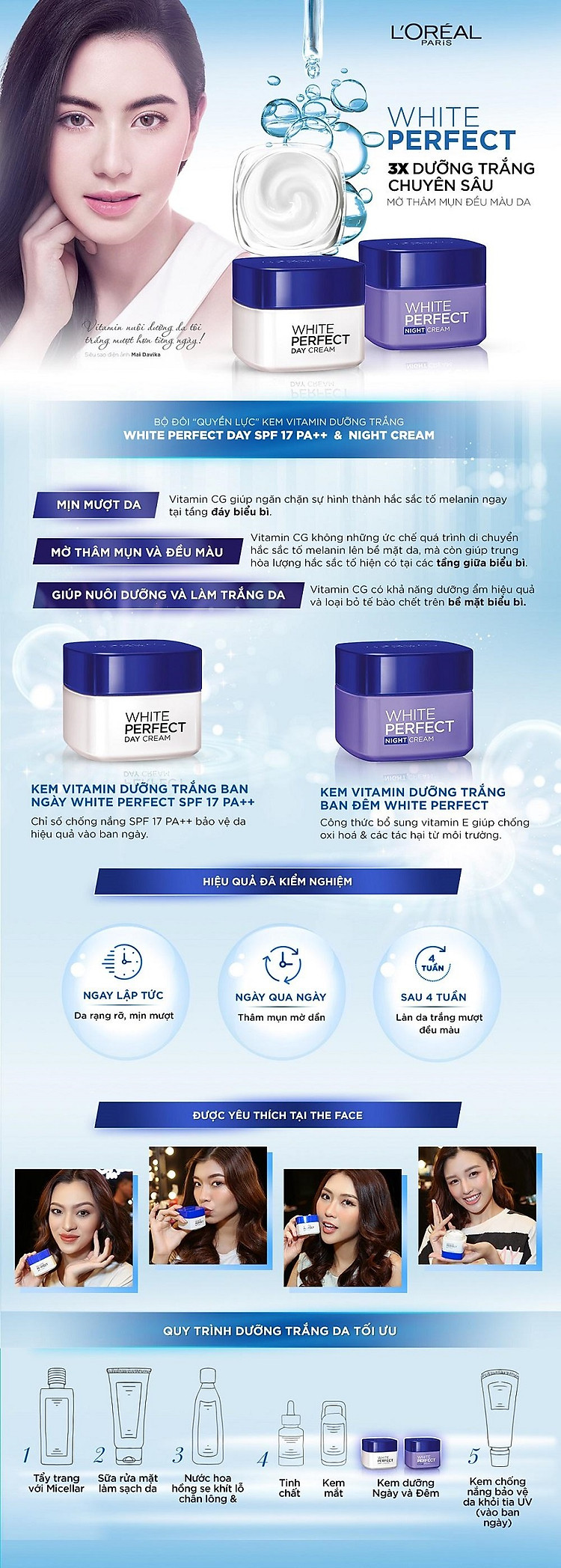 Kem dưỡng L’Oreal Paris White Perfect ban ngày SPF17 PA++ chứa vitamin CG giúp giảm, cân bằng hắc sắc tố ở mức thấp ; Glcerin tạo và lưu giữ độ ẩm trên da, tinh thể Tourmaline giúp thúc đẩy quá trình tuần hoàn dưới da chính là lựa chọn hoàn hảo cho làn da của bạm. Ngay lập tức, làn da được dưỡng ẩm mềm mịn và tươi sáng rõ rệt. Sau 1 tuần, làn da dần đều màu & được cải thiện rõ rệt. Sau 1 tháng, làn da trở nên trắng mượt, đều màu thấy rõ. Ngoài ra, sản phẩm tăng cường với SPF 17/PA++ giúp chống nắng và bảo vệ làn da trước tác hại của tia UV.
