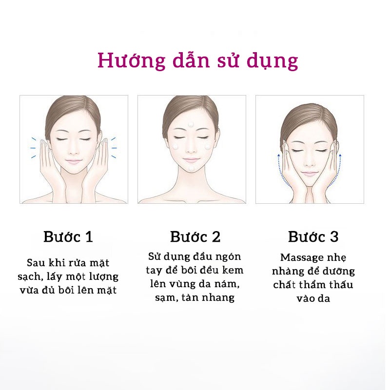 Làm sạch da mặt bằng sữa rửa mặt hoặc nước ấm, lau khô, lấy một lượng kem vừa đủ chấm vùng da nám, sạm, tàn nhang và cần chăm sóc. Massage nhẹ nhàng cho đều để hoạt chất thẩm thấu vào da.