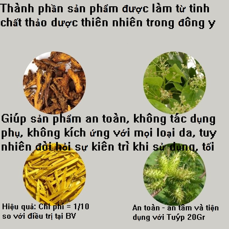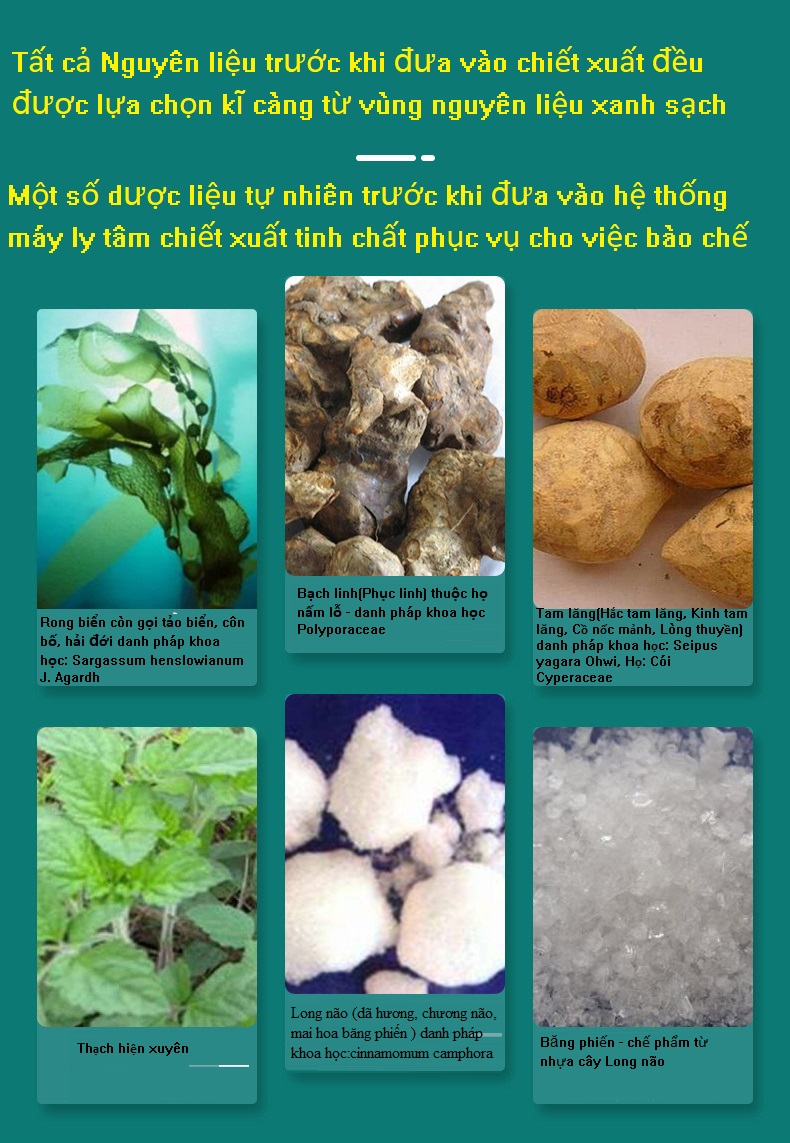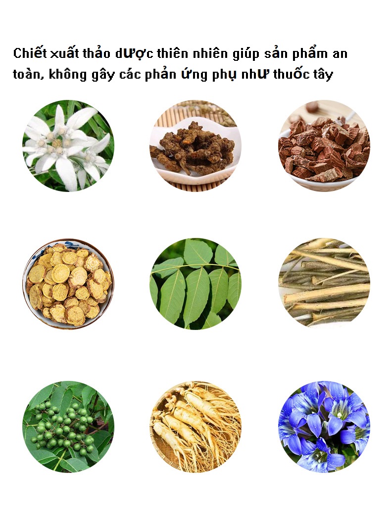 Thành phần chính: Tinh chất các loại thảo dược Pseudolaricis, Cortex Dictamni, Folium artemisiae argyi, Radix notoginseng, …Nước, alcoho, tá dược vừa đủ