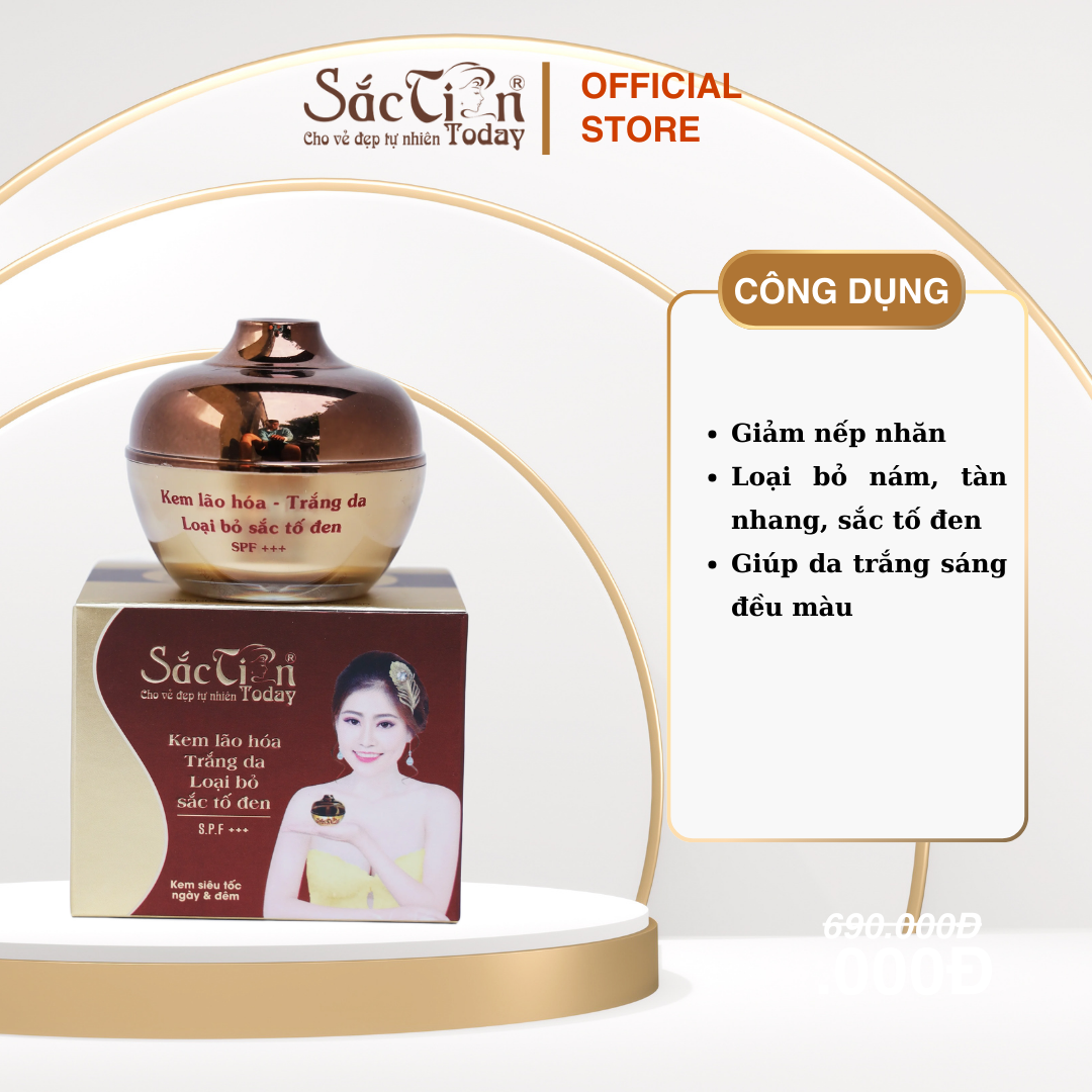 Kem Lão hóa, Trắng da loại bỏ sắc tố đen Sắc Tiên Today là một sự kết hợp hoàn hảo các tinh chất dưỡng da tự nhiên từ: dịch nhầy Ốc Sên, bột Ngọc Trai & Collagen giúp bảo vệ da khỏi tác hại của tia nắng mặt trời, làm trẻ hóa làn da, mờ vết nhăn, ngăn ngừa các vết sạm đen trên da mang lại làn da trắng sáng, mịn màng tự nhiên. Kem Lão hóa, Trắng da loại bỏ sắc tố đen Sắc Tiên Today còn giúp tăng sức đề kháng chống viêm da, làm đều tông màu, se khít lỗ chân lông giúp da căng mịn, trắng hồng tự nhiên.