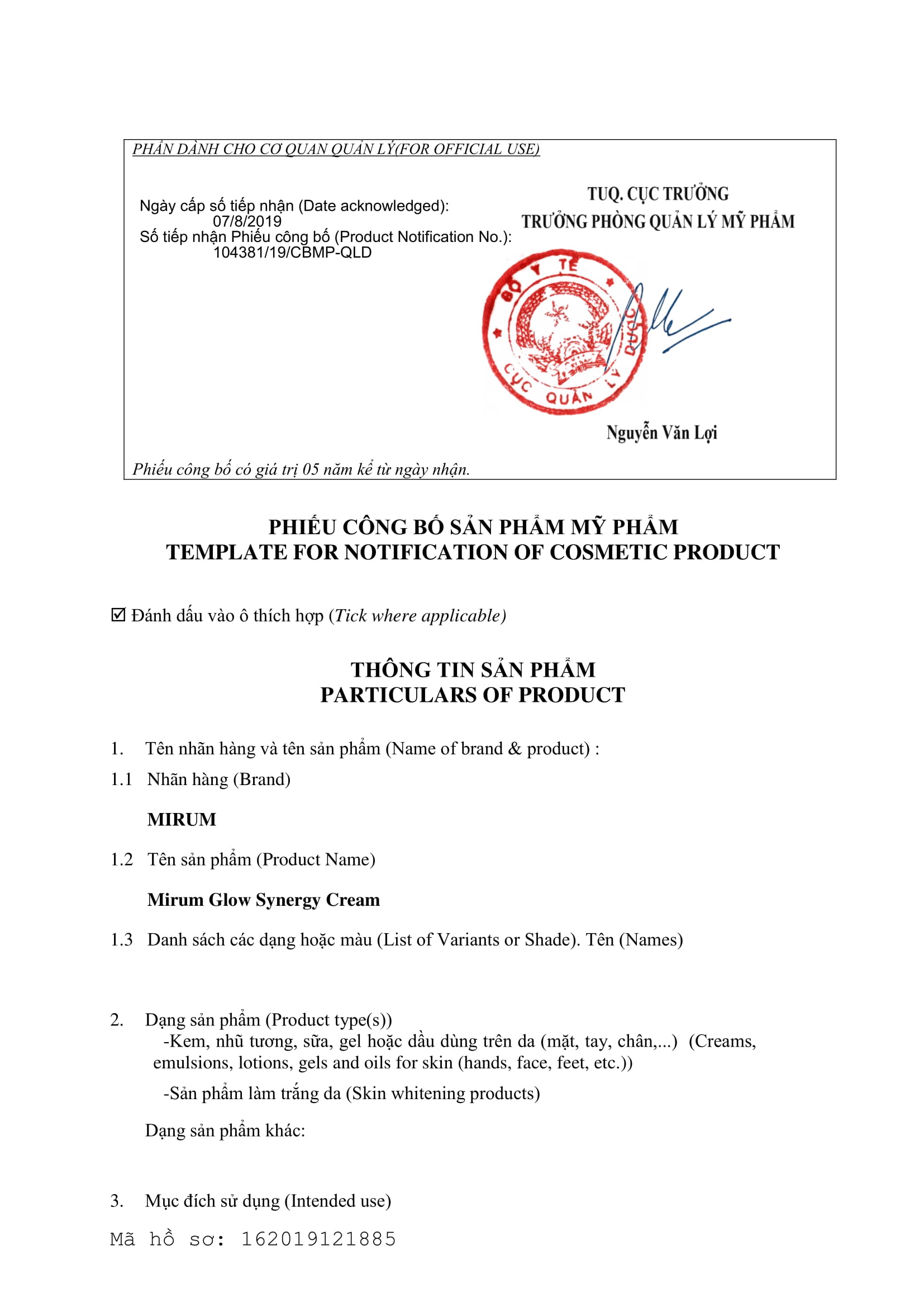 Kem Làm Trắng, Mờ Nám &Tàn Nhang Mirum đã được cấp Phiếu công bố mỹ phẩm số 104381/19/CBMP-QLD của Bộ Y tế và tem bảo hộ chống hàng giả của Bộ Công an nhằm chứng nhận sản phẩm an toàn & hợp pháp tại Việt Nam.