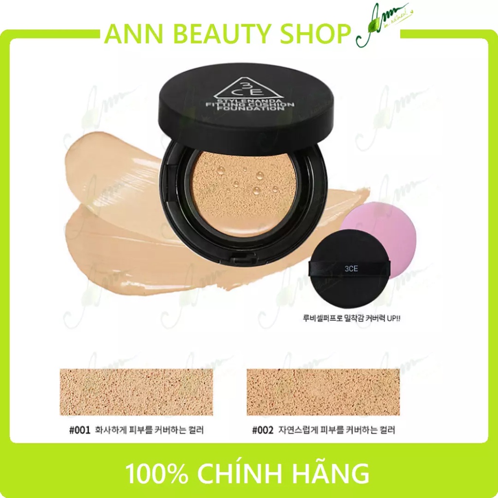 - 3CE FITTING CUSHION FOUNDATION là kem nền dạng nước chứa tinh chất làm trắng và dưỡng ẩm, mang lại độ dàn hồi căng mịn cho làn da. Sản phẩm có kết cấu mỏng nhẹ, khả năng che phủ hoàn hảo các lỗ chân lông, nếp nhăn và thâm mụn, mang đến lớp nền mỏng mịn không tì vết và tạo hiệu ứng căng bóng tự nhiên cho da.