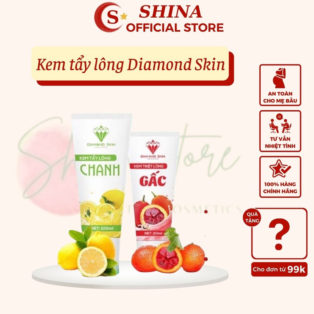 ✔ KEM TẨY LÔNG DIAMOND SKIN * So với các sản phẩm tẩy lông hiện nay thì tẩy lông Diamond Skin là một sản phẩm hoàn toàn đáp ứng được nhu cầu của người tiêu dùng: tẩy sạch lông, an toàn cho da, dưỡng da hiệu quả. * Thành phần: chứa hợp chất Thioglycolic. Những thành phần này có tác dụng phá vỡ liên kế chất sừng của từng sợi lông, khiến chúng phân rã và đứt gãy. * Ưu điểm - Tẩy được ở tất cả các vùng da: o Tẩy lông nách, o Tẩy lông chân tay o Tẩy lông body toàn thân o Tẩy lông vùng kín bikini o Tẩy râu, ria mép o Tẩy lông mặt - Dễ dàng sử dụng tại nhà - Tiết kiệm thời gian, tiền bạc không phải đi spa - Sạch bay từng cọng lông chỉ sau 5p - An toàn lành tính 100% - Lông thưa, mỏng dần sau mỗi lần sử dụng - Cung cấp dưỡng chất giúp da trắng sáng, mềm mịn hơn và thu nhỏ lỗ chân lông - Kết hợp với kem triệt lông Gấc được tặng kèm giúp bạn triệt lông vĩnh viễn sau 1 tháng sử dụng